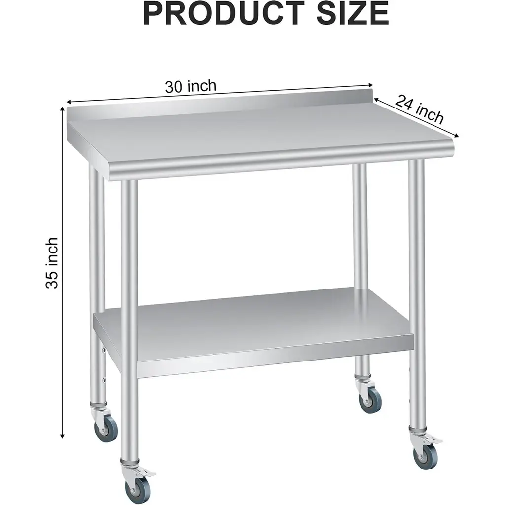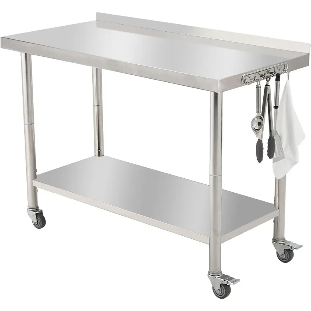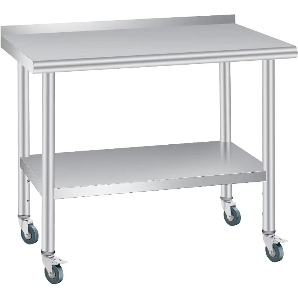 48"x24" Stainless Steel Table, Prep Table Stainless Steel Workbench, With Backsplash And Detachable Trash Rack, Shelves, 4 Wheels, Right Angle Side