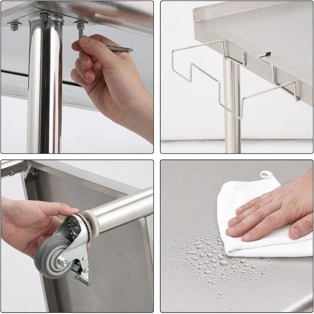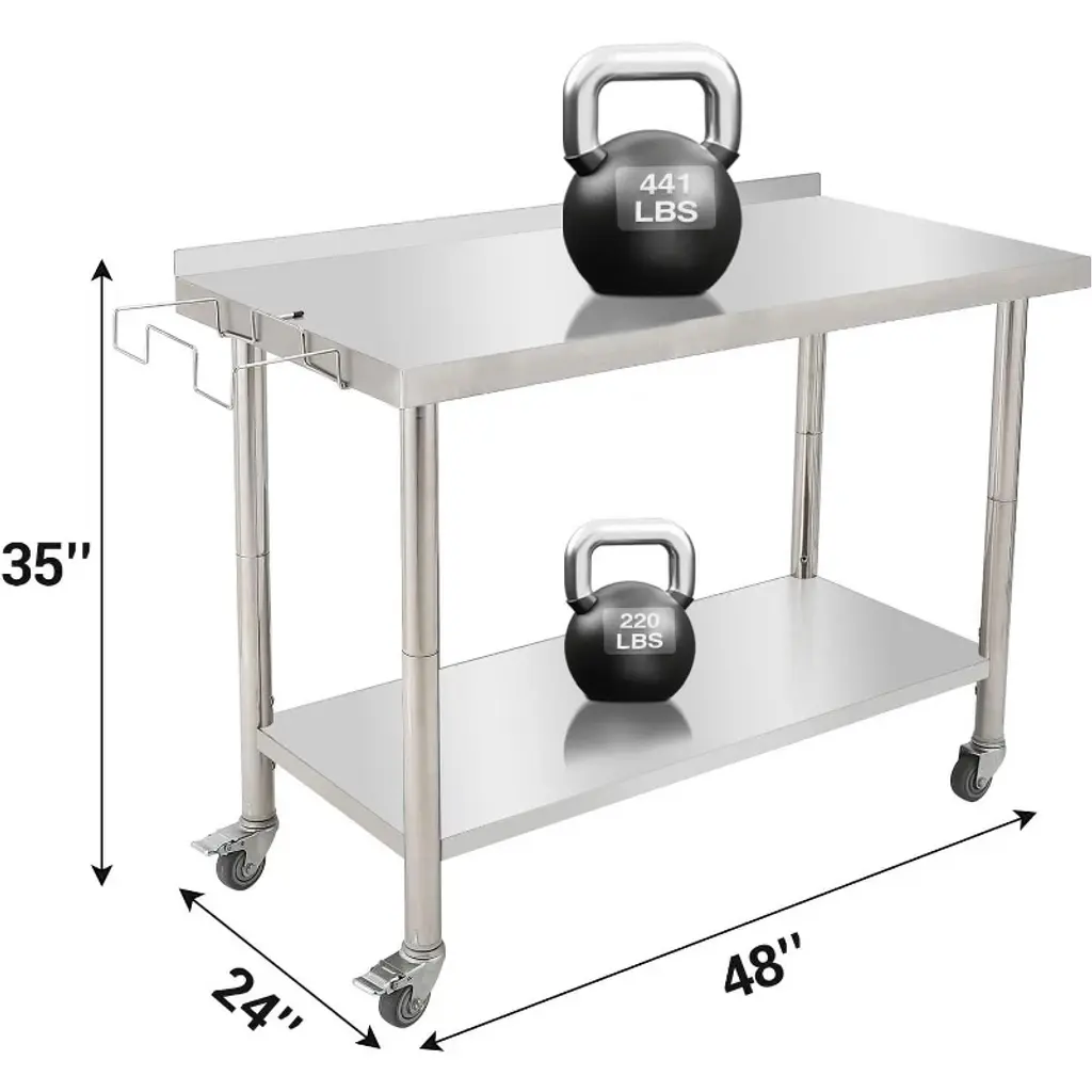 Introducing the 48"x24" Stainless Steel Table, a versatile and durable prep table designed to meet the demands of any professional or home workspace. Crafted from high-quality stainless steel, this workbench offers exceptional strength and resistance to rust and corrosion, making it perfect for kitchens, garages, workshops, bars, restaurants, laundry rooms, schools, hospitals, and warehouses. This stainless steel workbench features a spacious 48"x24" surface with an arc corner edge for added safety and comfort during use. The built-in backsplash prevents spills and debris from falling behind the table, keeping your workspace clean and organized. Equipped with sturdy three-layer metal shelves, it provides ample storage space for tools, ingredients, or supplies, helping you maintain an efficient and clutter-free environment. Designed for convenience, the table includes hooks for hanging utensils or equipment, ensuring everything you need is within easy reach. The four heavy-duty wheels allow for smooth mobility, making it easy to reposition the table wherever you need it most. Whether you need a reliable kitchen workbench, a robust garage or workshop table, or a functional storage solution for your business, this stainless steel prep table is the ideal choice. Key Features: - Durable stainless steel construction for long-lasting use and easy cleaning - Spacious 48"x24" work surface with arc corner edges for safety - Built-in backsplash to keep your workspace tidy - Three-layer metal shelves for ample storage and organization - Convenient hooks for hanging tools and utensils - Four heavy-duty wheels for easy mobility and repositioning Upgrade your workspace with this versatile and sturdy stainless steel workbench. Perfect for professional and home use, it combines practicality, durability, and mobility to help you work smarter and more efficiently.