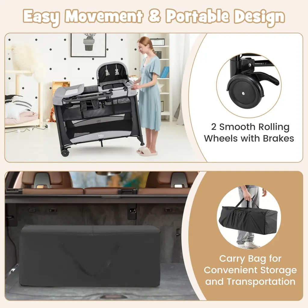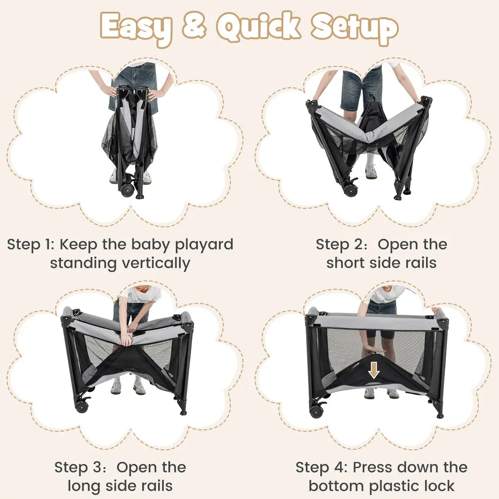 Our 5-in-1 portable baby playard is ideal to grow up with your baby! This baby playard comes with a changing table and a large storage basket, which provide great convenience for parents to change diapers or clothes for the baby. The waterproof & wear-resistant fabric is easy to wipe clean. The removable cradle with an adjustable canopy is perfect for the baby to have a sweet sleep while the hanging toys keep them entertained while awake. Besides, as your baby grows, it can transform into a playard after removing the mattress, cradle and diaper table. The 4-sided mesh netting with proper height provides good visibility and all-round protection. Plus, 2lockable wheels ensure smooth movement and added stability. The inclined angel is under 10 degrees, ensuring the safety of the baby.Thanks to the quick folding design, this baby set can be set up in seconds for convenient use. Besides, you can take it anywhere with the included carry bag. Feature5-in-1 design meets various needs and makes parents' lives easier 7-point supporting structure and sturdy iron tubes ensure high sturdiness 4-sided mesh nettings ensure good ventilation and provide better visibility Waterproof and anti-wear fabric for easy maintenance& long lasting use The large storage basket is convenient to hold various baby products 2 adorable hanging toys to entertain your baby while awake 0° inclined angel is under 10 degrees, ensuring the safety of the baby The soft and removable mattress provides a cozy sleeping space Smooth round corners and safety belt for higher security 2 wheels with brakes ensure easy movement and stability Foldable design and carrying bag for easy storage and transportationSpecificationColor: Black + Grey Material: Polyester Fabric, Sponge, Iron, PP Basic Baby Playard Size: 43.5" x 31" x 31" (L x W x H) Diaper Table Size: 31.5" x 20" (L x W) Cradle Size: 30" x 18" x 21.5" (L x W x H) Mattress Size: 40" x 27" (L x W) Folding Size: 31" x 10" x 10.5" (L x W x H) Weight Capacity of Basic Playpen: 33 lbs Weight Capacity of Baby Bed: 22 lbs Weight Capacity of Changing Table: 22 lbs Weight Capacity of Cradle: 22 lbs Net Weight: 34.5 lbs Applicable Age: 0-36 Months (Baby Playard) 0-6 Months (Baby Bed) Package Includes: 1 x Basic Baby Playard 1 x Diaper Changing Table 1 x Cradle with 2 Hanging Toys 1 x Mattress 1 x Storage Basket 1 x Carrying Bag 1 x Instruction