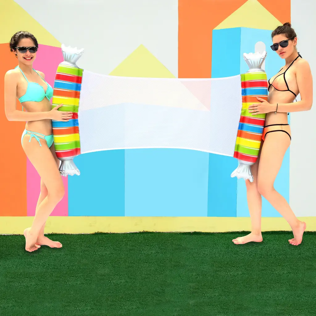 Keep yourself cool with this mesh water hammock. Inflatable candies keep your head and feet afloat while your body skims the water through the mesh hammock. A truly stylish way to float the day away! Candy mesh water hammock Inflatable candy head and feet rests Recommended age: 8 and up Max weight 176lbs Repair patch included Dimensions: 8" high x 37.5" wide x 57" long Material(s): PVC