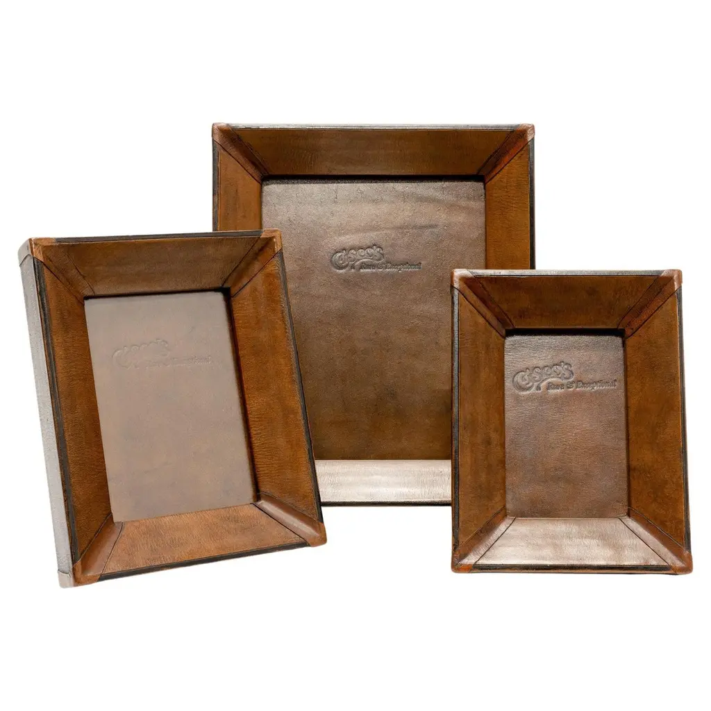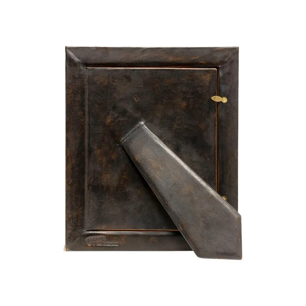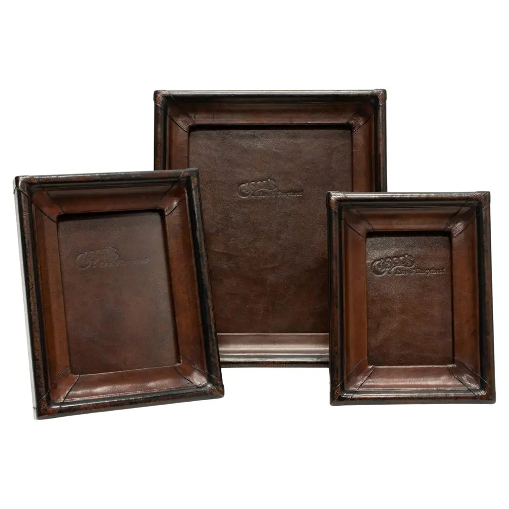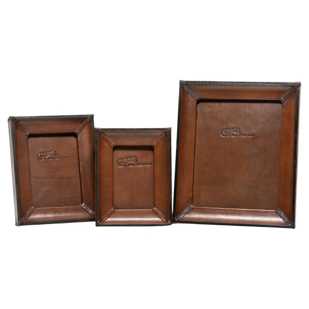 5x7 medium brown & black leather tabletop picture frame. Premium leather picture frames add the perfect accent to any home or office. Each frame is skillfully crafted by artisan saddle makers using genuine cowhide. Color: Medium brown with distressed thin black border and black edges. Style: Overlaid leather corner detail. Three sizes available; 4"x6" Frame 6 1/2" x 8 1/2"-$110, 5"x7" Frame 7 1/2" x 9 1/2"-$135, 8"x10"10 1/2" x 12 1/2"-$200. More colors and style available. Visit our 1st Dibs page to see the full collection. Inventory: D1379Family Owned & OperatedCisco’s Gallery deals in the rare, exceptional, and one-of-a-kind pieces that define the history of America and the Old West. Our pieces range from American Indian to Cowboy Western and include original items of everyday life, commerce, art, and warfare that tamed America’s frontier. Our 14,000 square foot gallery opened in 1996 in beautiful Coeur d’Alene, Idaho.Personal ServiceCisco’s operates on old fashioned values – honesty and integrity, and all of our items are backed by our money back guarantee. We appreciate the opportunity to earn your business. Whether you desire assistance with a jewelry purchase, choosing a gift, identification, or even selling – we hope to be your trusted source. Picture frame, leather, leather frame, hide, southwestern, western, photo frame, decor, display, tabletop frame