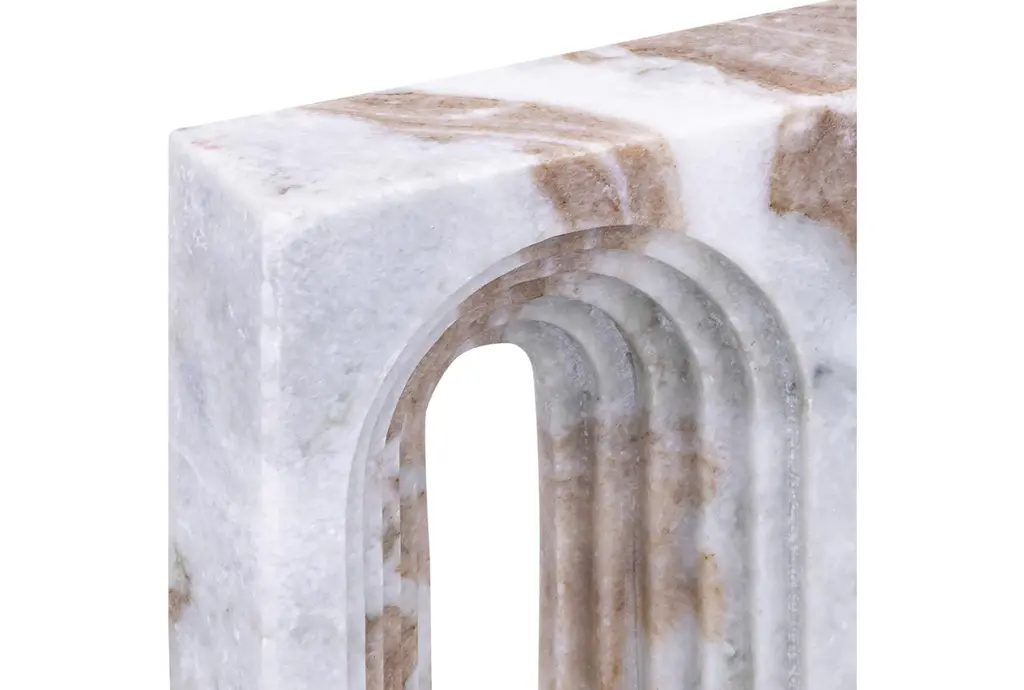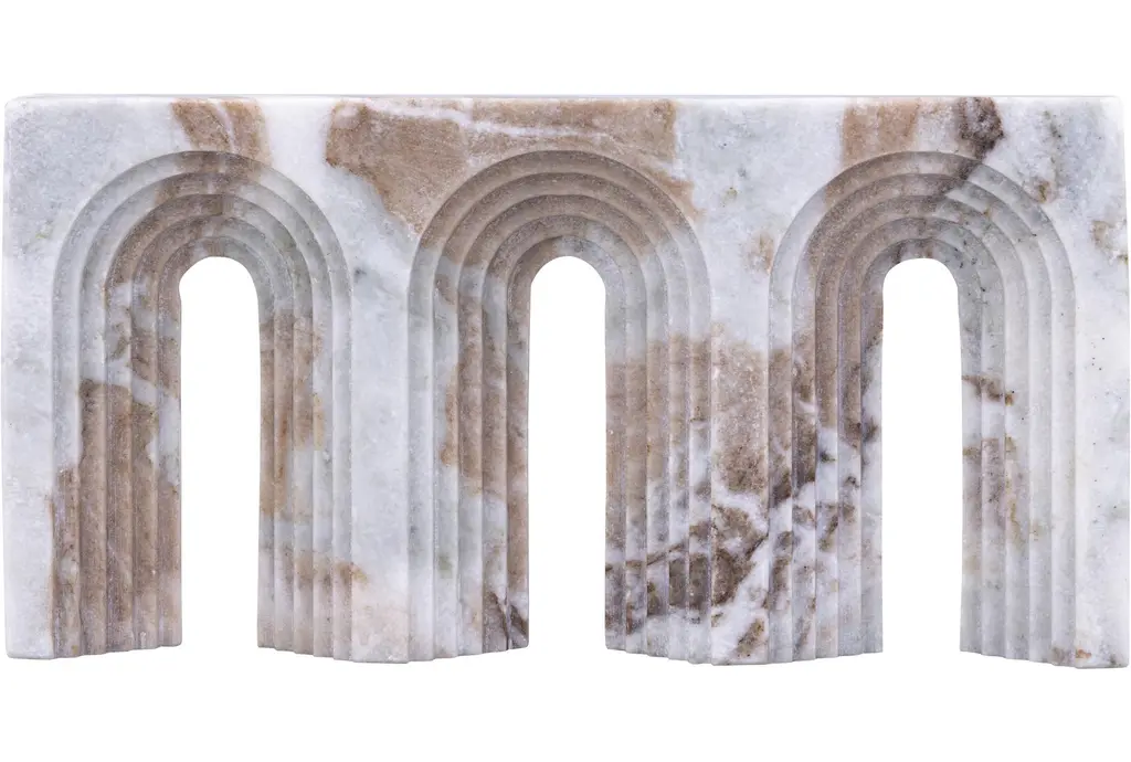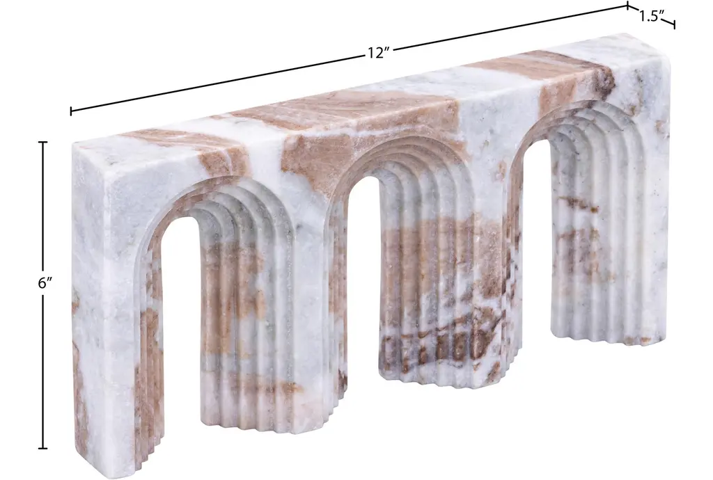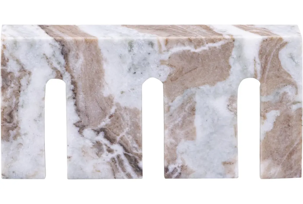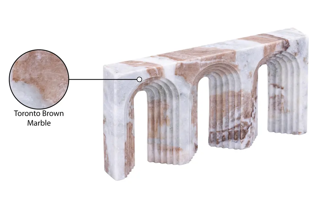 Enhance your living space with the 6" X 12" Curva Brown Marble Table Decor. This modern piece features a unique curved shape that adds a touch of sophistication to any room. The brown marble material provides a natural, earthy feel that complements contemporary decor.