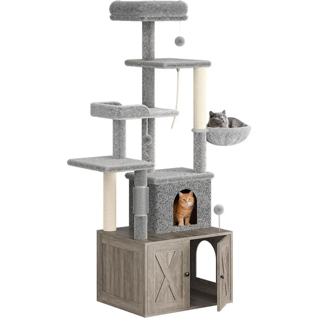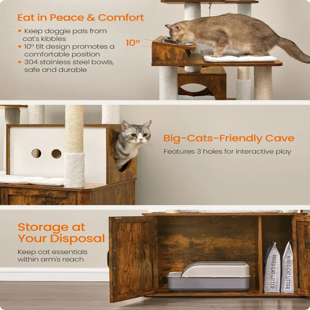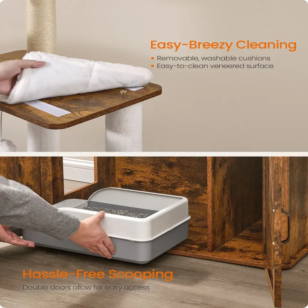 66.9-Inch Cat Tower With Litter Box Enclosure And Comfortable Removable Cushions - Rustic-Brown