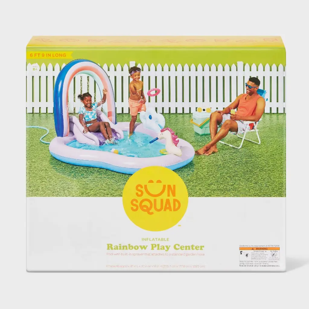 Bring home a splash of fun with the 70'' x 92'' x 50'' Play Center Update 34 gal Novelty Kiddie Pool Rainbow from Sun Squad™. This vibrant inflatable play center features a slide, rings, balls and a unicorn hoop for endless entertainment. With a 34-gallon capacity, it's ideal for little ones to cool off and play for hours.Sun Squad™: Ready for fun.