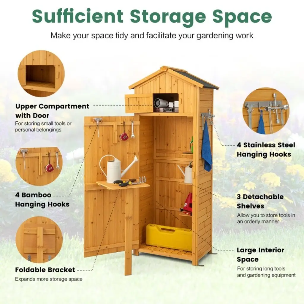 SpecificationsKey Features● Practical Garden Shed: This outdoor wooden storage shed measures 29.5" x 20" x 71" (L x W x H), which is perfect for organizing messing items without taking up much floor space. It is ideal for storing various tools and accessories. Moreover, with the one-piece folding table, it can also be used as a workbench to take care of plants. ● Sufficient Storage Space: This multifunctional garden shed provides classified storage areas to make your space tidy and facilitate your gardening work. It is equipped with an upper compartment with door, 3 detachable shelves, a foldable table for storing small items, and a large interior space for large tools. Moreover, there exist 4 bamboo hanging hooks and 4 stainless steel hanging hooks for easy access to gadgets. ● Weatherproof Design: This outdoor storage shed adopts a weatherproof asphalt roof, which can effectively protect the shed from rain, wind, and sunlight. And the slope design avoids water accumulation. Besides, the elevated bottom helps keep items away from moisture and dust. ● Stable Structure and Lockable Doors: The doors are connected to the wooden frame by rustproof stainless steel hinges, ensuring long-term outdoor use. And the garden shed can be firmly fixed on the ground by 4 metal brackets for good stability. In addition, it is equipped with convenient wooden latches to lock the doors, ensuring safety. ● Solid Wood Material: The raised garden bed is crafted with selected fir wood, which is characterized by high hardness and deformation resistance, ensuring excellent durability. And the wooden surface is coated with waterproof painting, ensuring great weather resistance.