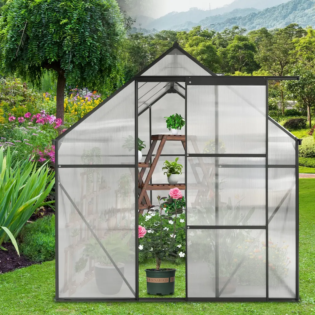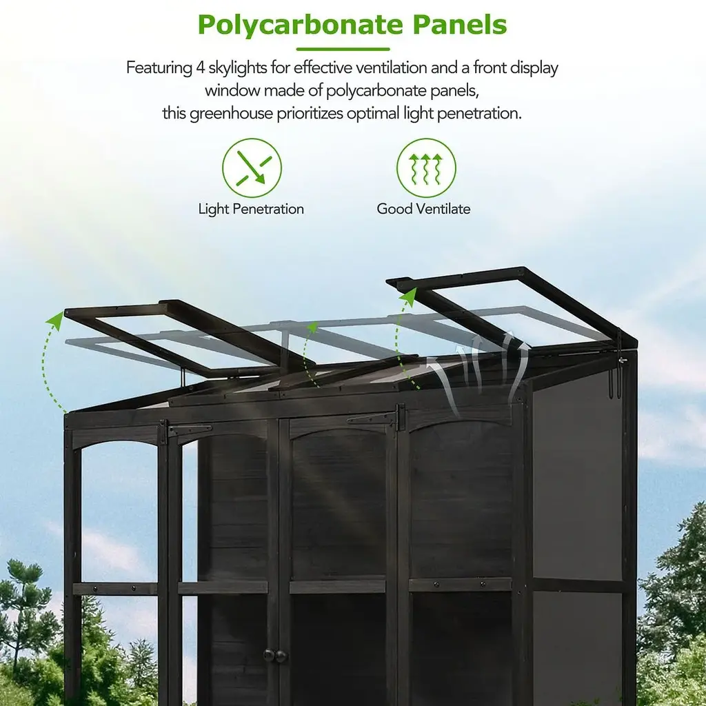 Create your green oasis with our Walk-in Wooden Greenhouse. Crafted from sturdy fir wood, it offers a spacious haven for your plants. With two folding middle shelves and side shelves, organization is a breeze. The polycarbonate panels ensure optimal light penetration, while the double-sided door provides easy access. Stability is guaranteed with anti-fall protection. Experience the perfect fusion of form and function!Features:Specifications: