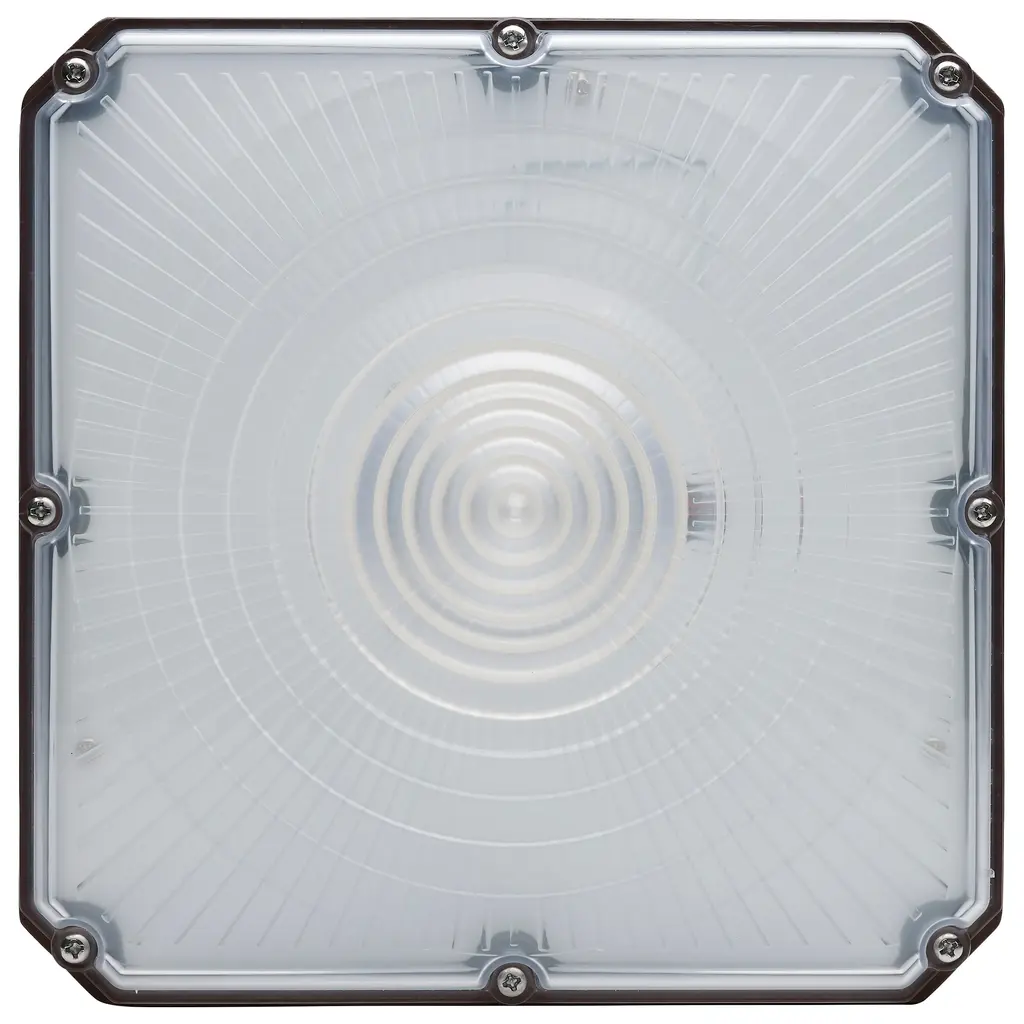 8.5 Inch LED Field Selectable Canopy Fixture With Sensor - 25/30/40 Watts - 3K/4K/5K CCT - 120-277 Range Voltage. SATCO|NUVO's 65-982 Field Selectable 8.5-inch square canopy fixture is an ideal choice for multiple applications. This fixture gives users the flexibility to choose from three wattage and three CCT options during installation. It also features an integrated microwave sensor, enhancing energy efficiency and providing added functionality. With a choice of surface mounting using the hinged universal bracket or 3/4-inch pendant mounting, installation of this luminary is a breeze. The two side knockouts allow for wiring access to be fast and efficient. The sleek bronze die-cast aluminum housing, the IK08 impact-rated vandal-resistant polycarbonate lens, and the IP65 wet location rating ensure reliable illumination even in the most adverse weather conditions.