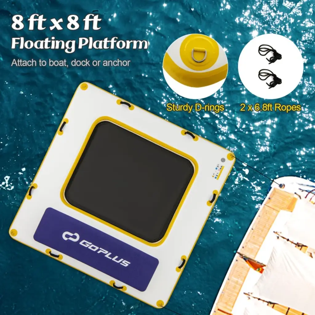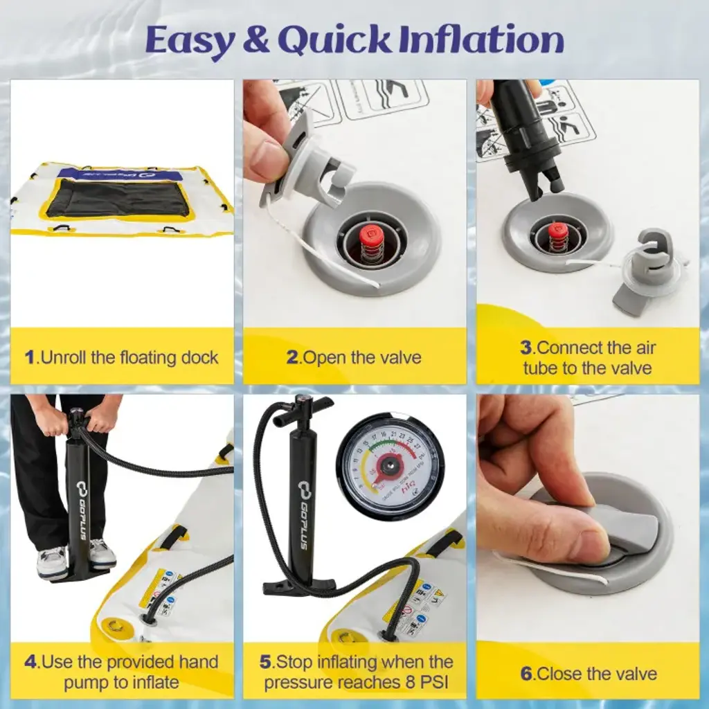 Specifications: Description: Enjoy a spacious and stable floating platform with this 8ft x 8ft inflatable mat, perfect for lounging, tanning, or water sports. Accommodating up to 3 people with a 600 lbs capacity, it's ideal for lakes, beaches, oceans, or pools. Crafted from reinforced PVC, it offers durability and puncture resistance, while the non-slip EVA mat ensures safety. The bonus dock insert converts into a mesh swim lounge for cooling off in the water. Quick to inflate in just 3 minutes with the included hand pump, it deflates compactly for easy transport in the carry bag. Thoughtful features include stainless steel D-rings, ropes for docking, portable handles, and a repair kit for convenient maintenance.Key Features: