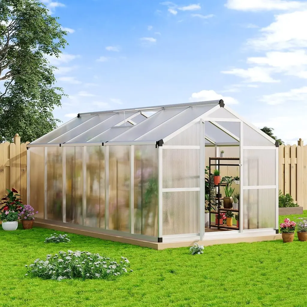 Effortless Assembly: Set up your gardening space quickly with our greenhouse kit, which comes complete with a clear instruction manual and all the necessary tools. The innovative slide-in polycarbonate (PC) panels make assembly 40% faster and 35% more secure compared to traditional methods, allowing you to save time and effort while creating a reliable outdoor greenhouse. Resilient Construction: Built to withstand challenging weather conditions, our greenhouse features durable 720g/m² polycarbonate panels and a robust aluminum steel frame. This construction ensures stability and protection for your plants during heavy rain and strong winds, guaranteeing a safe and thriving environment. Efficient Water Management: The cleverly designed water gutter system along the sides of the greenhouse aids in effective drainage and rainwater collection. This feature simplifies maintenance and provides a sustainable water source for your plants, contributing to eco-friendly gardening practices. Optimized Ventilation: Promote plant health with the adjustable ventilation system in our greenhouse. The top vent allows you to control airflow, maintaining an optimal internal climate for your plants. This ensures proper air circulation, which is essential for vigorous growth and overall improved plant health. Embrace Garden Life: Transform your gardening experience by soaking up the sun and creating a joyful space filled with lush greenery. Our greenhouse is designed to enhance your gardening activities, allowing you to cultivate a vibrant and thriving garden environment.