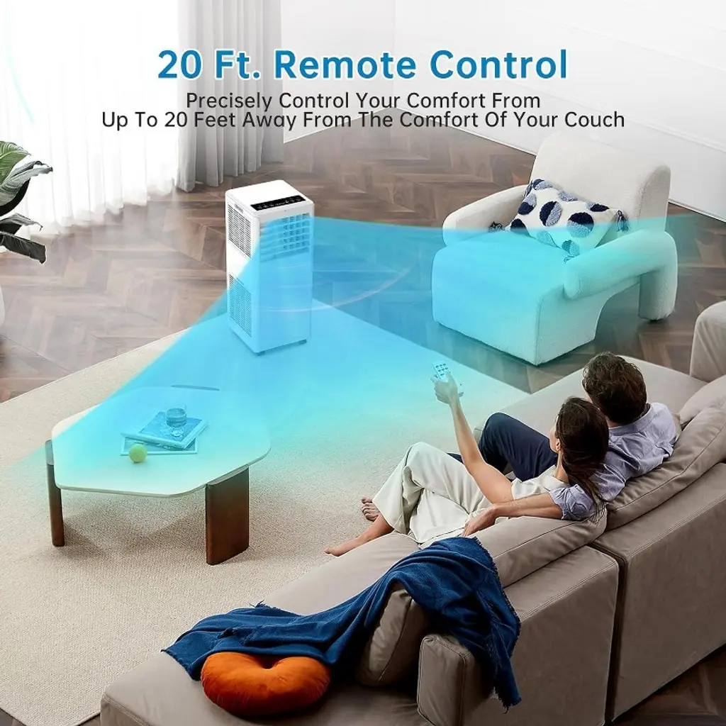 Efficient Climate ControlExperience powerful cooling performance with this 8,000 BTU portable AC unit, specifically designed to cool spaces up to 350 sq.ft efficiently. The energy-saving operation helps reduce electricity costs while maintaining optimal comfort in bedrooms, offices, or small apartments.3-in-1 Versatile Functionality1. Cooling Mode: Rapid temperature reduction with adjustable settings2. Dehumidifier: Removes excess moisture for improved air quality3. Fan Mode: 3-speed airflow options for customized circulationQuiet & Comfortable Operation? Advanced noise reduction technology for peaceful environments? Dedicated Sleep Mode ensures undisturbed rest? 24-hour programmable timer for automatic operationUser-Friendly Features? Simple LED display with intuitive controls? Full-function remote control (included)? Easy-to-clean washable filter? Auto-swing louvers for even air distributionTechnical Specifications Cooling Capacity: 8,000 BTU Coverage Area: Up to 350 sq.ft Operating Modes: Cool/Dry/Fan Fan Speeds: 3 adjustable levels Noise Level: Reduced operation in sleep mode Power Requirements: 115V/60Hz Package Includes Portable AC unit Window installation kit Exhaust hose Remote control (batteries included) Washable air filter User manual Perfect for small spaces, this energy-efficient portable air conditioner delivers quiet, powerful cooling with easy operation and hassle-free mobility. The sleek black design complements any room while providing reliable temperature control.