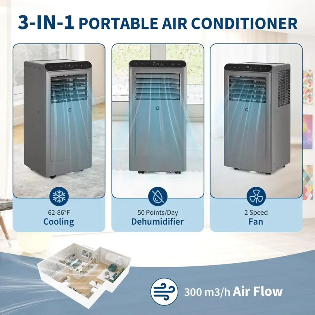 8000 Btu 3-in-1 Portable Air Conditioner With Remote - Cools Rooms Up To 250 Sq Ft - Dehumidifier, Fan, Sleep Modegray