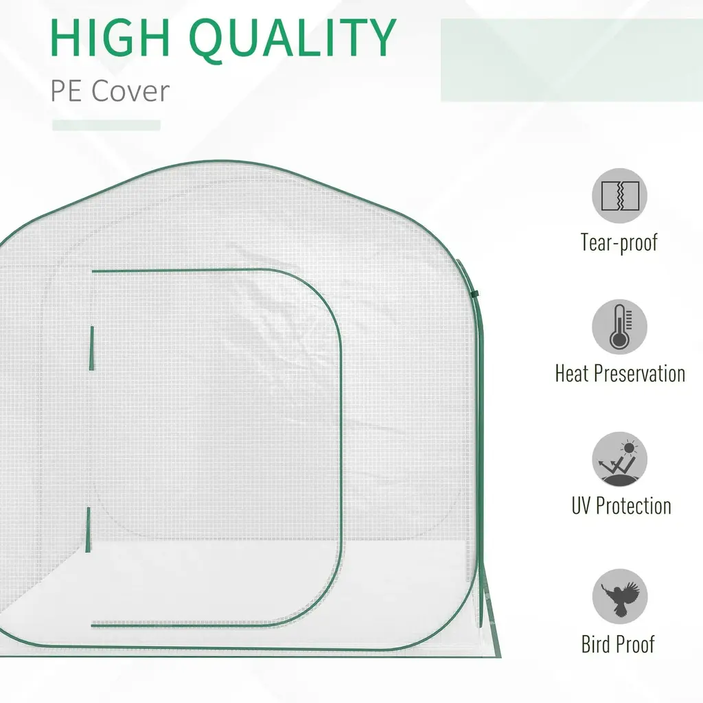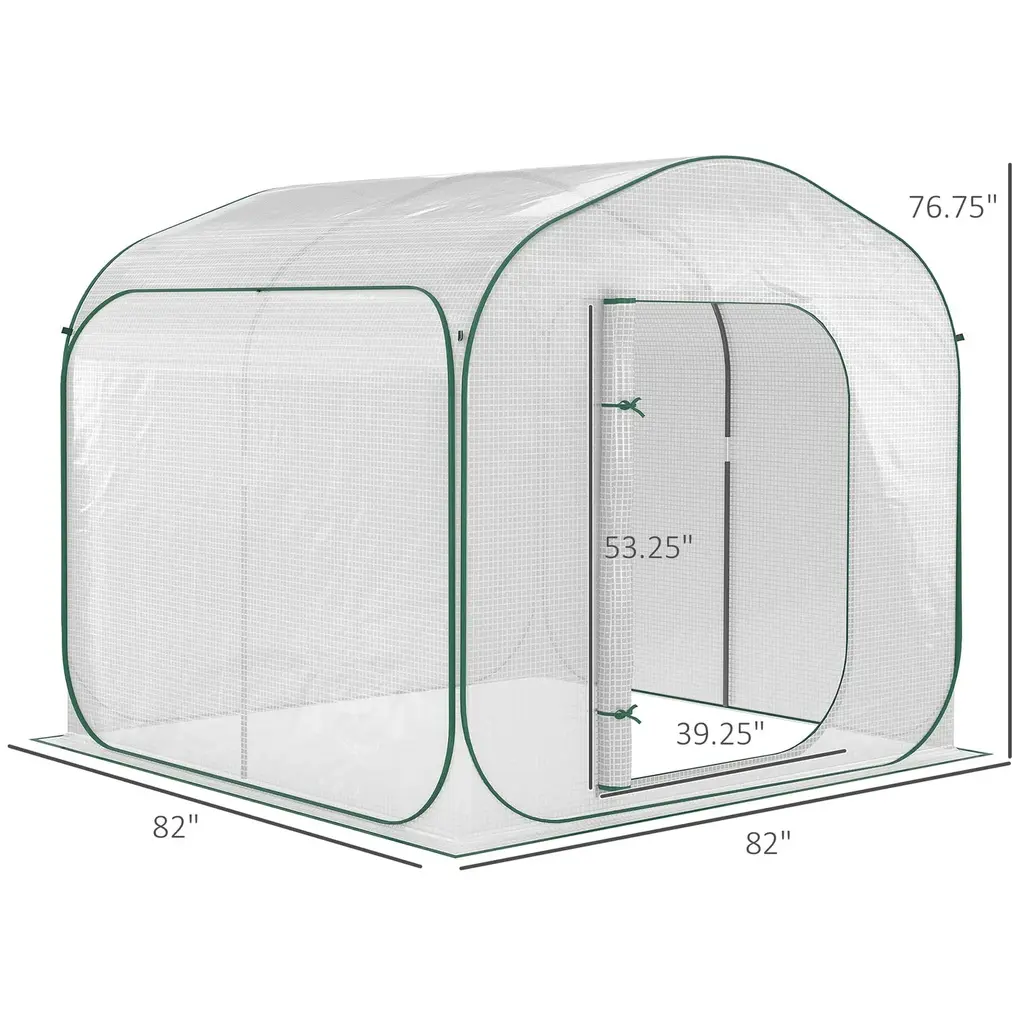 The Outsunny 7' x 7' x 6' Portable Walk-in Greenhouse is a versatile and convenient gardening solution designed for gardeners of all skill levels. This greenhouse features a pop-up setup, making it easy to assemble and disassemble, and it can be moved to different locations to optimize sunlight exposure. Its dimensions of 7 feet in length, 7 feet in width, and 6 feet in height provide ample space for a variety of gardening activities.The greenhouse includes a zipper door, offering easy access and a secure closure to protect your plants from pests and harsh weather conditions. It is suitable for growing a wide range of plants, including flowers, herbs, vegetables, saplings, and succulents, making it a versatile addition to any garden.The white color of the greenhouse cover reflects sunlight, reducing heat buildup and providing a cooler environment for plants that prefer cooler temperatures. This feature is particularly beneficial for growing plants that are sensitive to excessive heat.Overall, the Outsunny Portable Walk-in Greenhouse is an excellent choice for those looking to create a controlled environment for their plants outdoors, offering convenience, durability, and ample space for a variety of gardening needs.