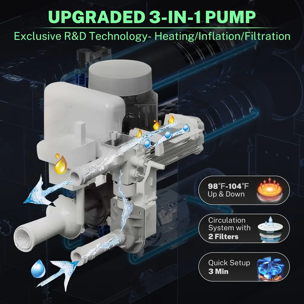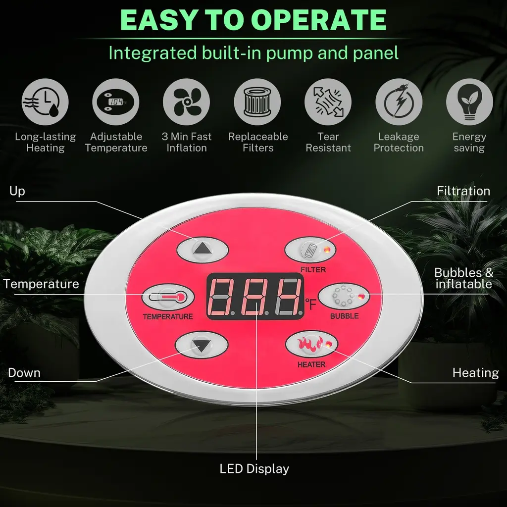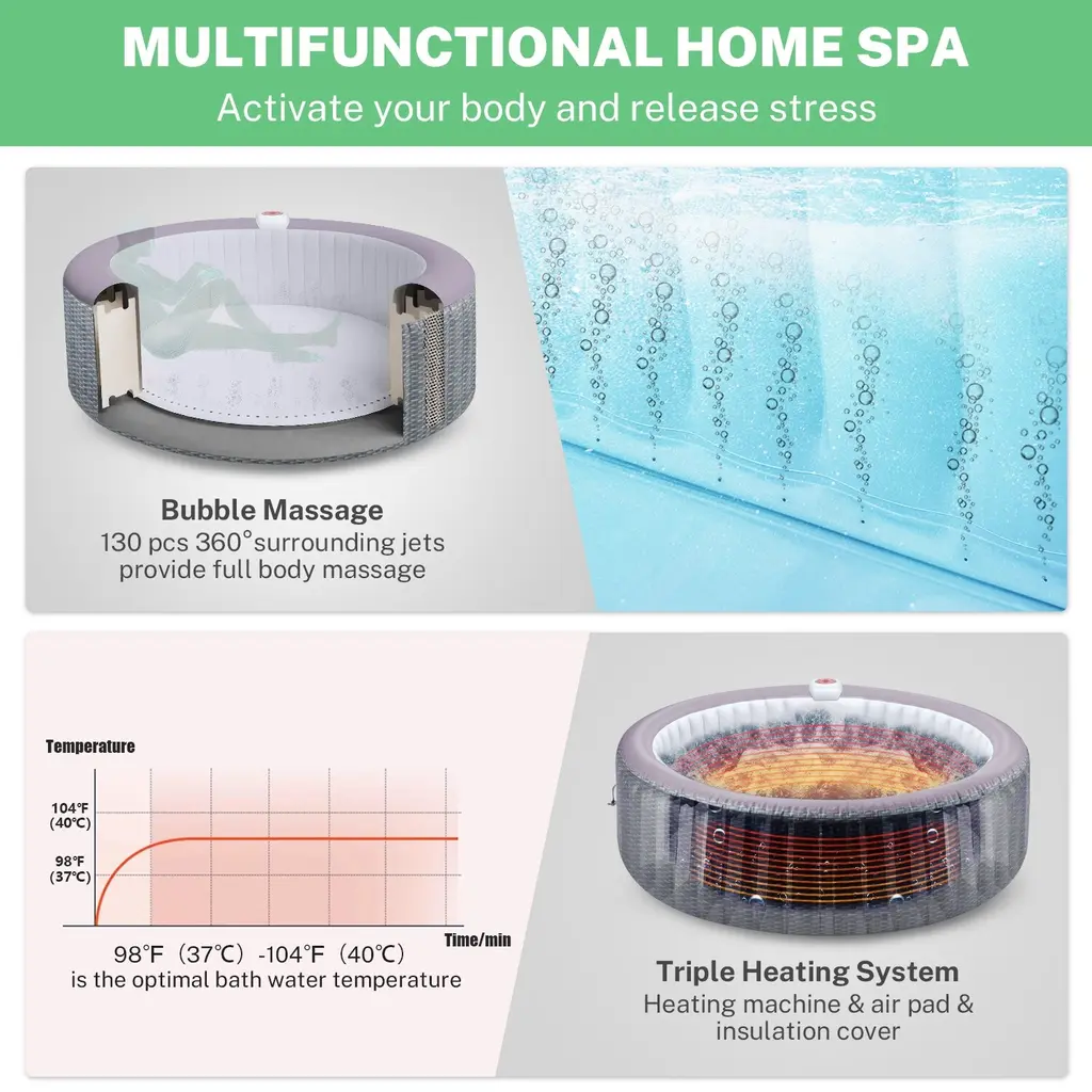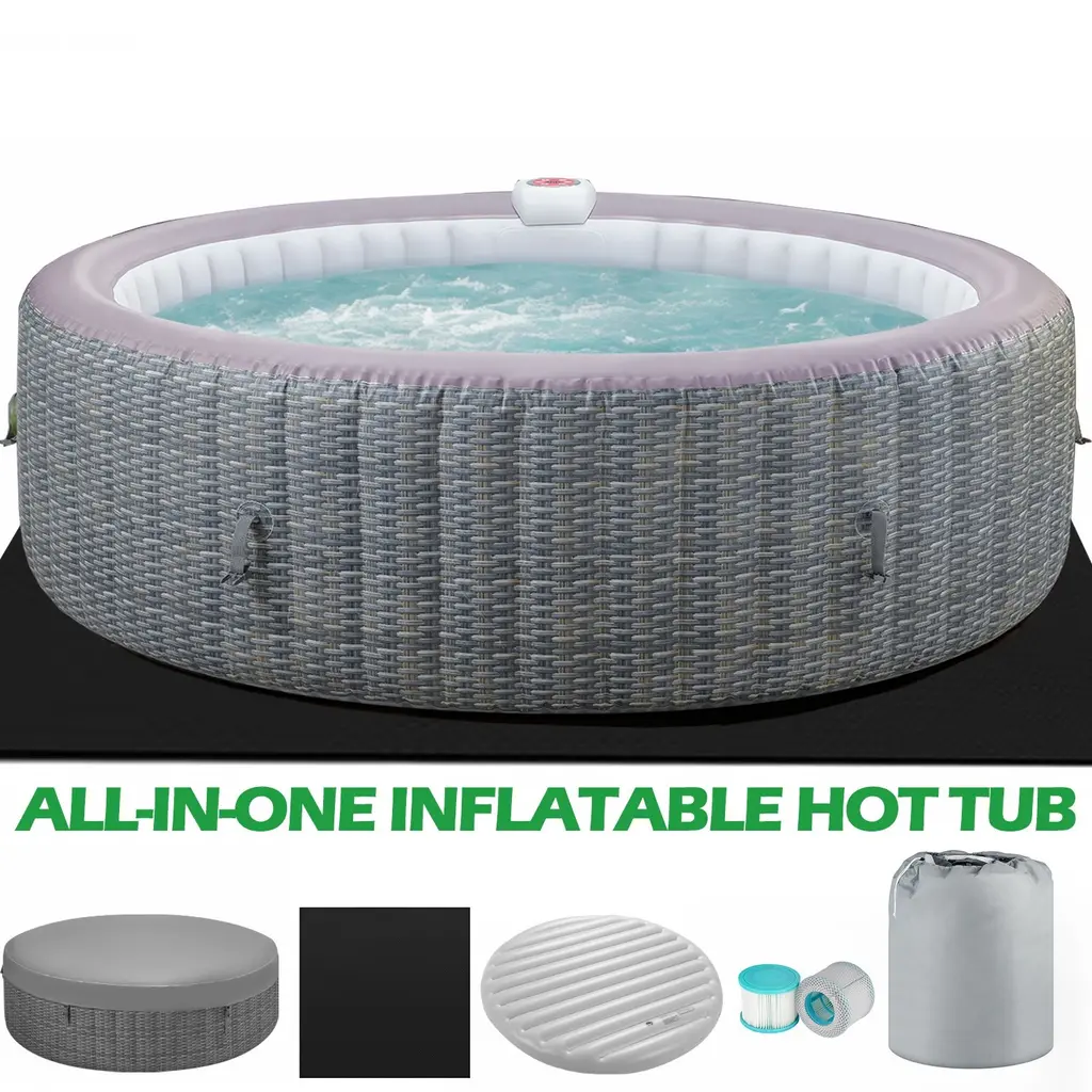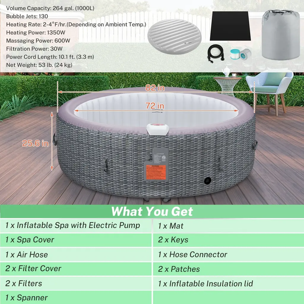 DescriptionExperience luxury and relaxation with the 82'' Inflatable Hot Tub, designed to transform your backyard into a personal spa oasis. With its 130 bubble jets, built-in control panel, and energy-efficient features, this hot tub promises an unparalleled spa experience for 6-8 people. Enjoy a soothing soak at home, no matter the season, with our durable and portable hot tub solution. Product Features【Hot Tub with Bubble Massage】: The inflatable hot tub, which accommodates 6-8 people, is heated to a soothing Maximum Temperature: 104 F (40 °C), and enveloped by a halo of 130 powerful bubbles at the bottom. It also has an integrated water filtration system to keep the water pristine. 【Upgraded Built-in Control Panel】: The outdoor hot tub's integrated design comprises a built-in electric air pump and control box for ease of use. The thickened PVC shell safeguards the machine for outdoor use. At the same time, the overall appearance is beautiful. 【Energy Saving Spa Cover】: The lockable spa cover considerably reduces the time and frequency needed to heat your outdoor hot tub. Additionally, it shields against debris entering the water, thus minimizing the filtration process. 【Energy Saving Spa Cover】: The lockable spa cover considerably reduces the time and frequency needed to heat your outdoor hot tub. Additionally, it shields against debris entering the water, thus minimizing the filtration process. 【Portable & Quick Setup】: Requiring a mere 3-minute setup, this hot tub has side handles for easy moving. Using the included zip ties and storage bag, your family can enjoy the hot spring spa experience anytime, anywhere!Product InformationMain materials: metal + laminated PVCColor: PurplePattern: Imitation rattanShape: RoundCapacity: 6 peopleVolume: 264 gal/1000LNumber of air injection holes: 130Input Power: 110–120 V~ 60 HzRated Power: Jets-600W/Heater-1350W/Filter-30WMax. Temperature: 104°F/40°CFiltration Rate: 6 gpmPower Cord Length: 10 ft. 10 inNet Weight: 53 lbsDiameter:Outer: 81.88'' x 81.88'' x 25.6''(LxWxH)Jets: 0.12''diaDrain Tube: 1.2''Package Includes:1 x Inflatable Hot Tub Spa w/ Electric Pump1 x Cover1 x Inflatable Pad1 x Air Hose2 x Filters1 x Filter Cover1 x Spanner2 x Keys of Cover1 x Mat1 x ⅝″ Hose Connector2 x Patches1 x Storage Bag