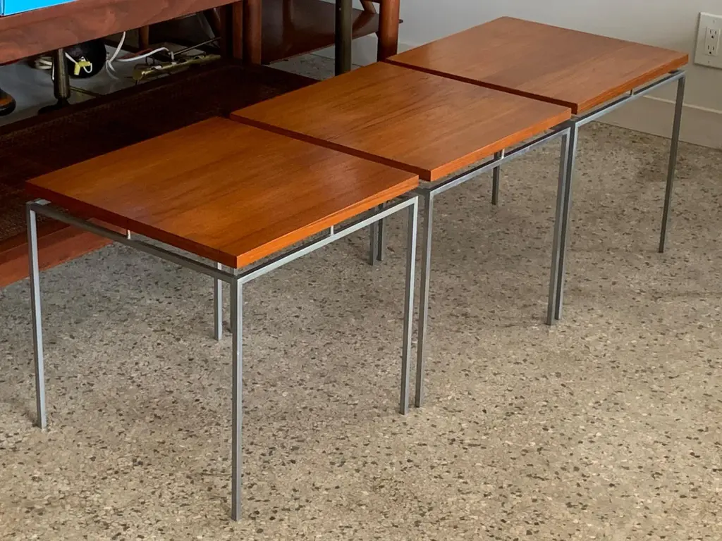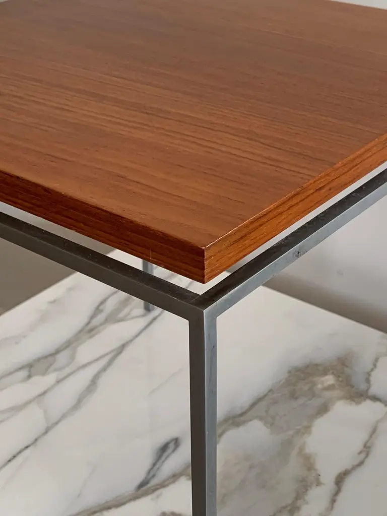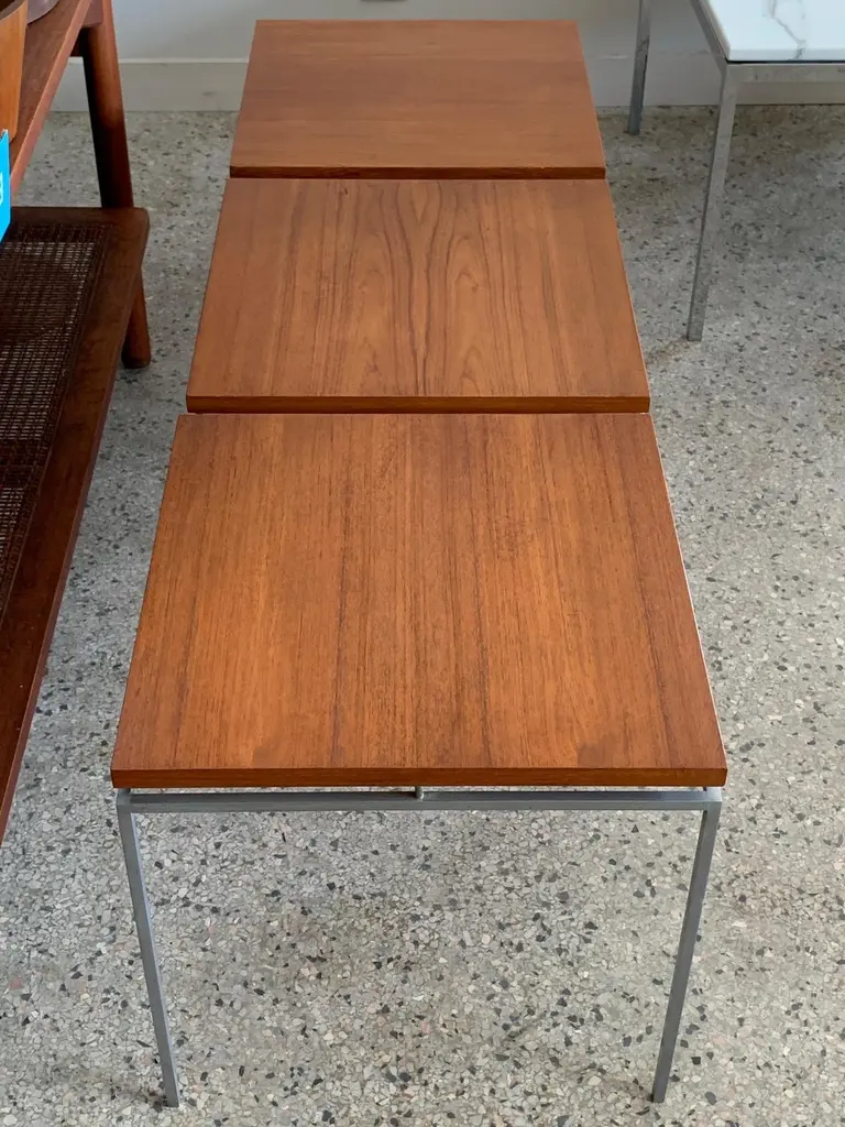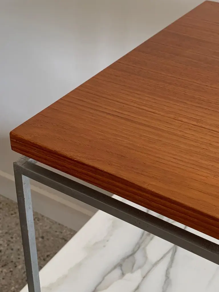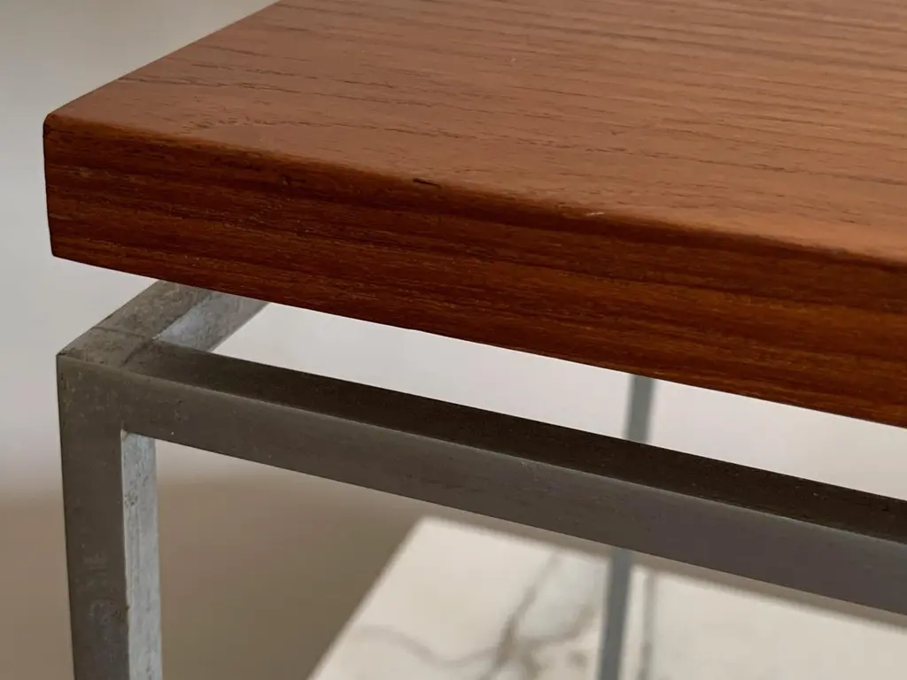 A classic Knud Joos occasional table in steel and teak for Jason Mobler, model 600. Priced individually at $1,500. Classic Minimalist design. Three available.