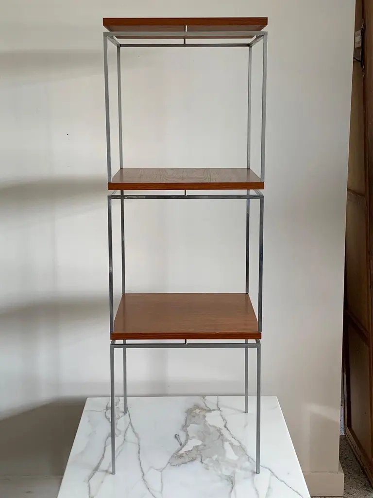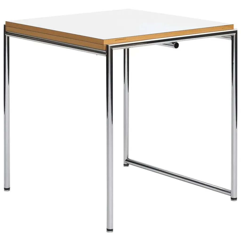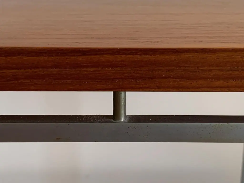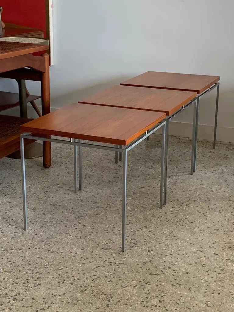 A classic Knud Joos occasional table in steel and teak for Jason Mobler, model 600. Priced individually at $1,500. Classic Minimalist design. Three available.