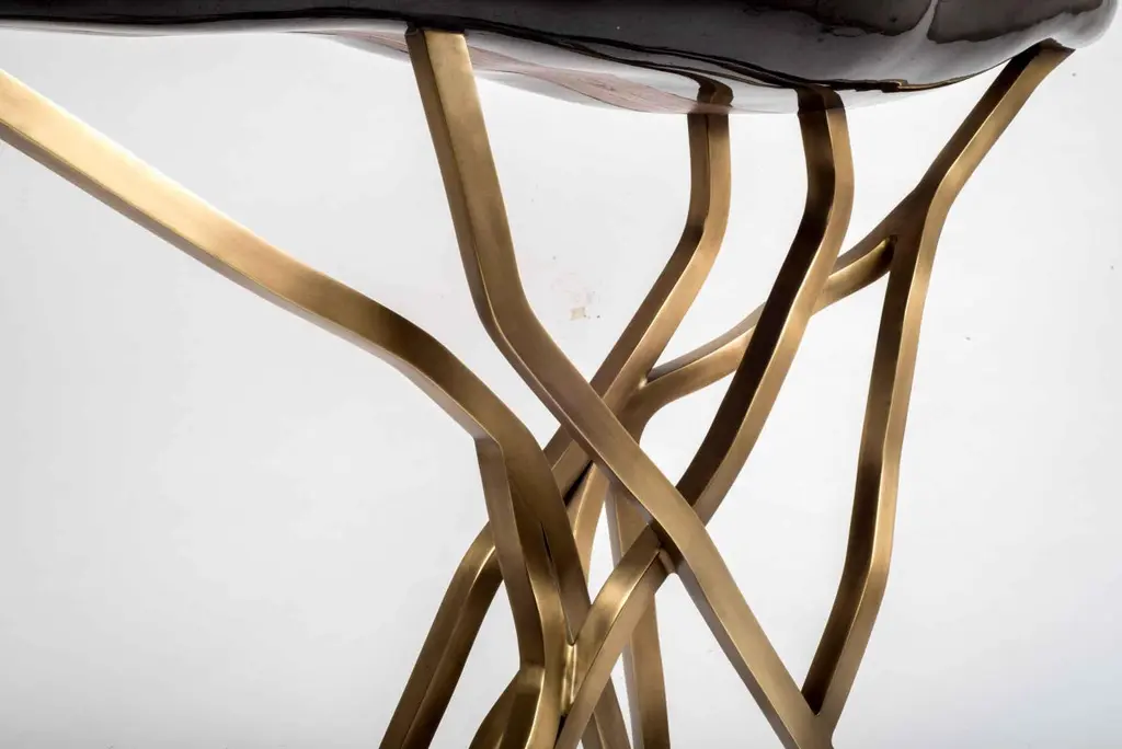 The Paris based label has distinguished themselves since their launch, with their iconic use of shagreen mixed with brass and other exotic materials. All furniture is handcrafted by skilled artisans, ultimately making each piece unique, designed in Paris and produced in the Philippines.The Acacia console table makes for a dramatic statement piece in any space. The amorphous shaped top is in cream and the organic shaped legs are in bronze-patina brass. Available in black shell as well, see images at end of slide.The dimensions of this piece are 150 x 43 x 90 cm / 50" x 17.75" x 35.5"All R&Y Augousti pieces are handmade by artisans, ultimately making each piece unique. Custom color/sizing available on request. Wipe clean with soft dry cloth.Acclaimed design duo Ria & Yiouri Augousti have established themselves since the 1990s as pioneers of modern-vintage style through their luxurious Art Deco inspired collections. The Paris based label has distinguished themselves since their launch, with their iconic use of shagreen mixed with brass and other exotic materials. All furniture is handcrafted by skilled artisans, ultimately making each piece unique.All shagreen-covered items should be kept out of direct sunlight, color variants may occur on the stingray and other exotic finishes, but this showcases the Parisian label's commitment to creating authentic luxurious products using natural components.