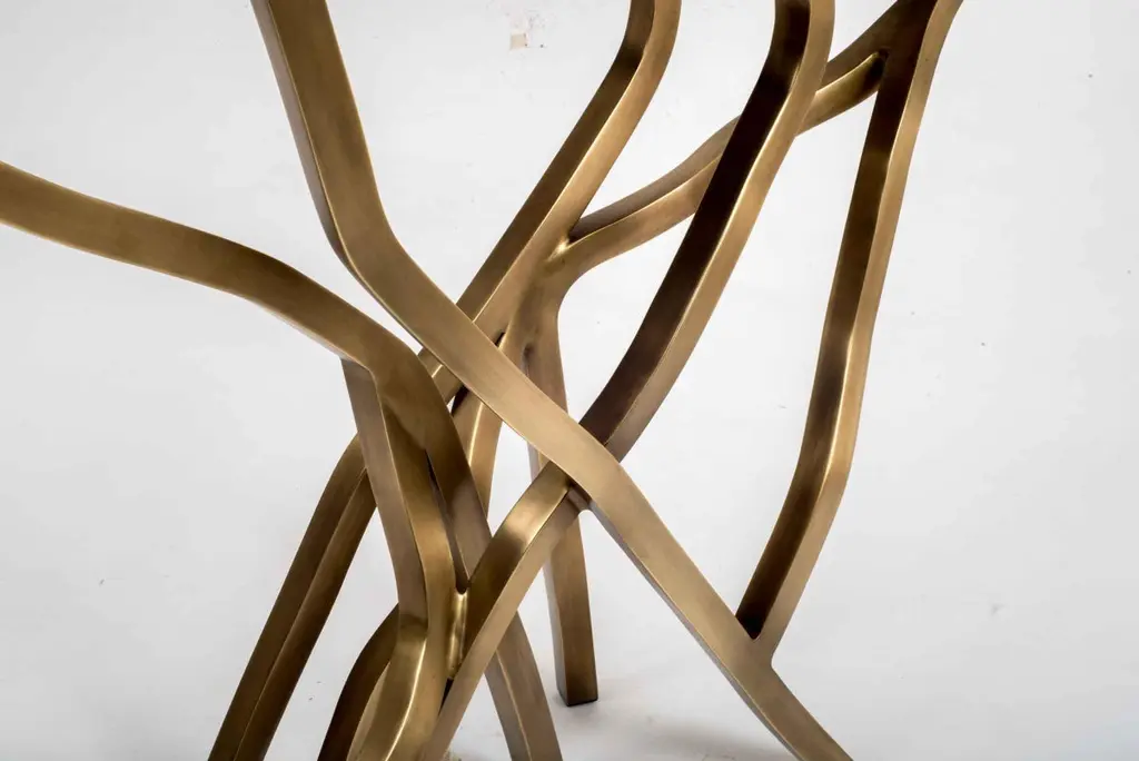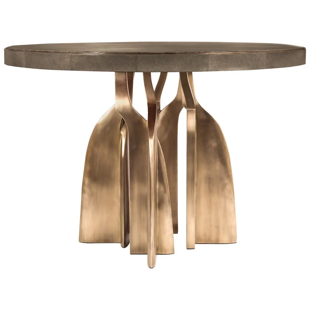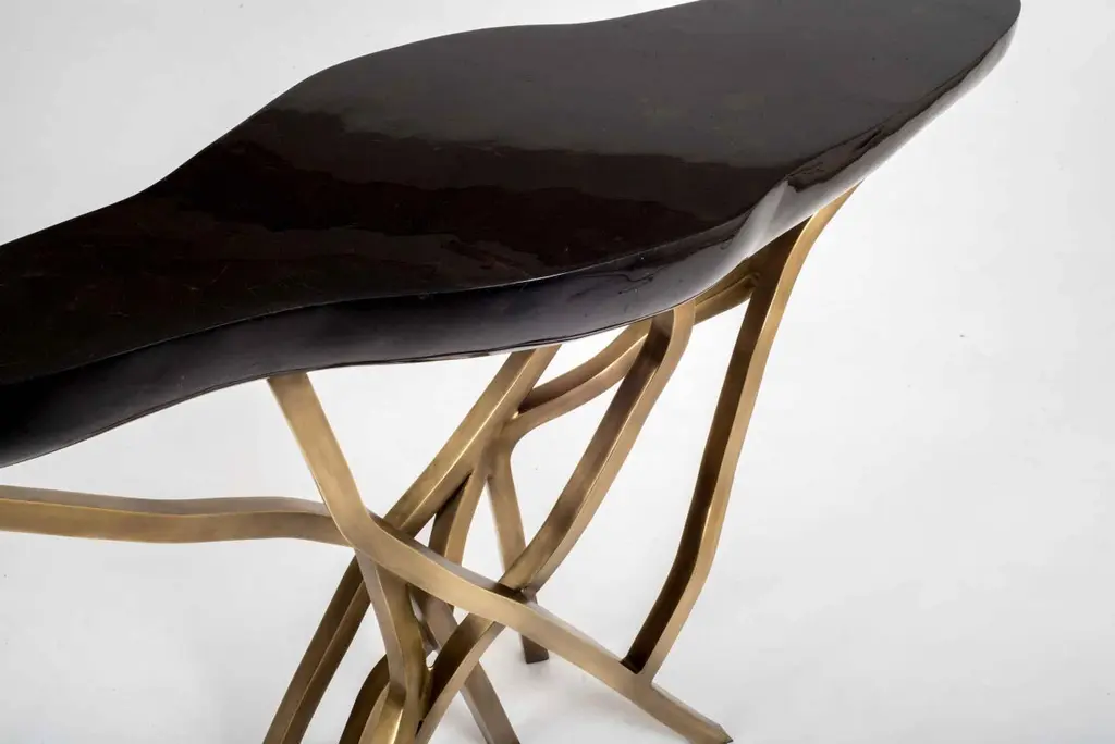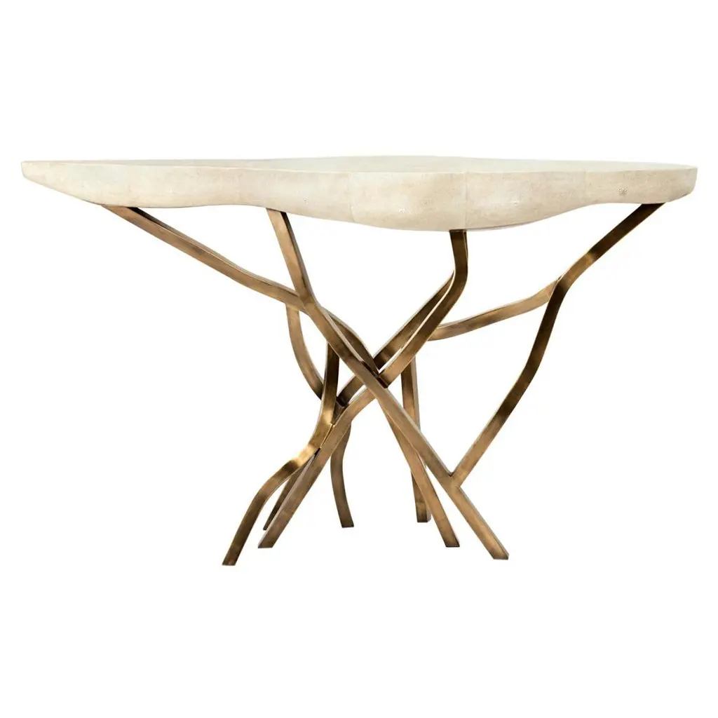 The Paris based label has distinguished themselves since their launch, with their iconic use of shagreen mixed with brass and other exotic materials. All furniture is handcrafted by skilled artisans, ultimately making each piece unique, designed in Paris and produced in the Philippines.The Acacia console table makes for a dramatic statement piece in any space. The amorphous shaped top is in cream and the organic shaped legs are in bronze-patina brass. Available in black shell as well, see images at end of slide.The dimensions of this piece are 150 x 43 x 90 cm / 50" x 17.75" x 35.5"All R&Y Augousti pieces are handmade by artisans, ultimately making each piece unique. Custom color/sizing available on request. Wipe clean with soft dry cloth.Acclaimed design duo Ria & Yiouri Augousti have established themselves since the 1990s as pioneers of modern-vintage style through their luxurious Art Deco inspired collections. The Paris based label has distinguished themselves since their launch, with their iconic use of shagreen mixed with brass and other exotic materials. All furniture is handcrafted by skilled artisans, ultimately making each piece unique.All shagreen-covered items should be kept out of direct sunlight, color variants may occur on the stingray and other exotic finishes, but this showcases the Parisian label's commitment to creating authentic luxurious products using natural components.