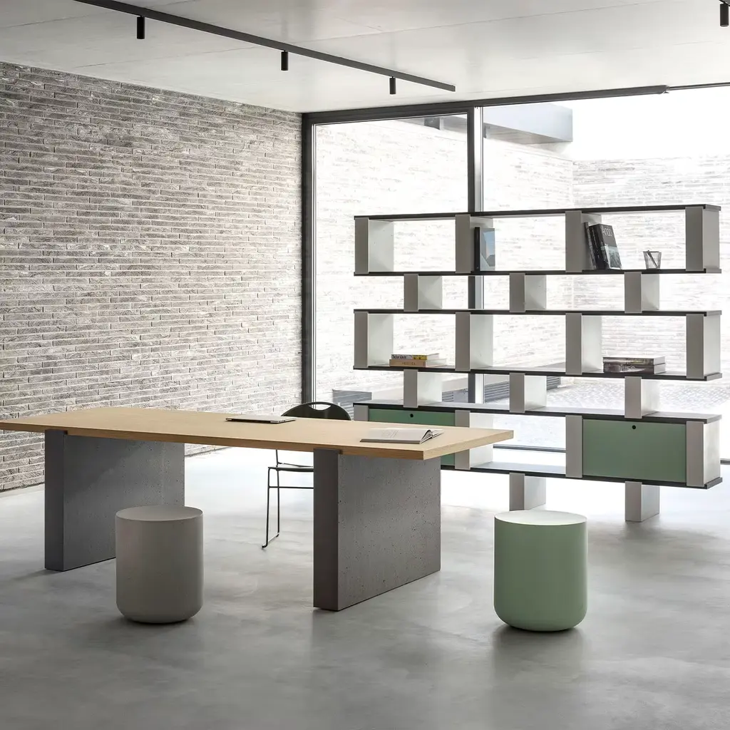 Linear outlines and natural materials for a table that invites conviviality: the traditional support surfaces made of bricks and wooden boards are reinterpreted in a contemporary key through the combination of legs in CIMENTO® and top in essence. Accademia tables, much more than simple furnishing accessories, are functional and versatile and give character to both home and office spaces. Available in different lengths, colors, and combinations. Please, ask the Concierge for further details
