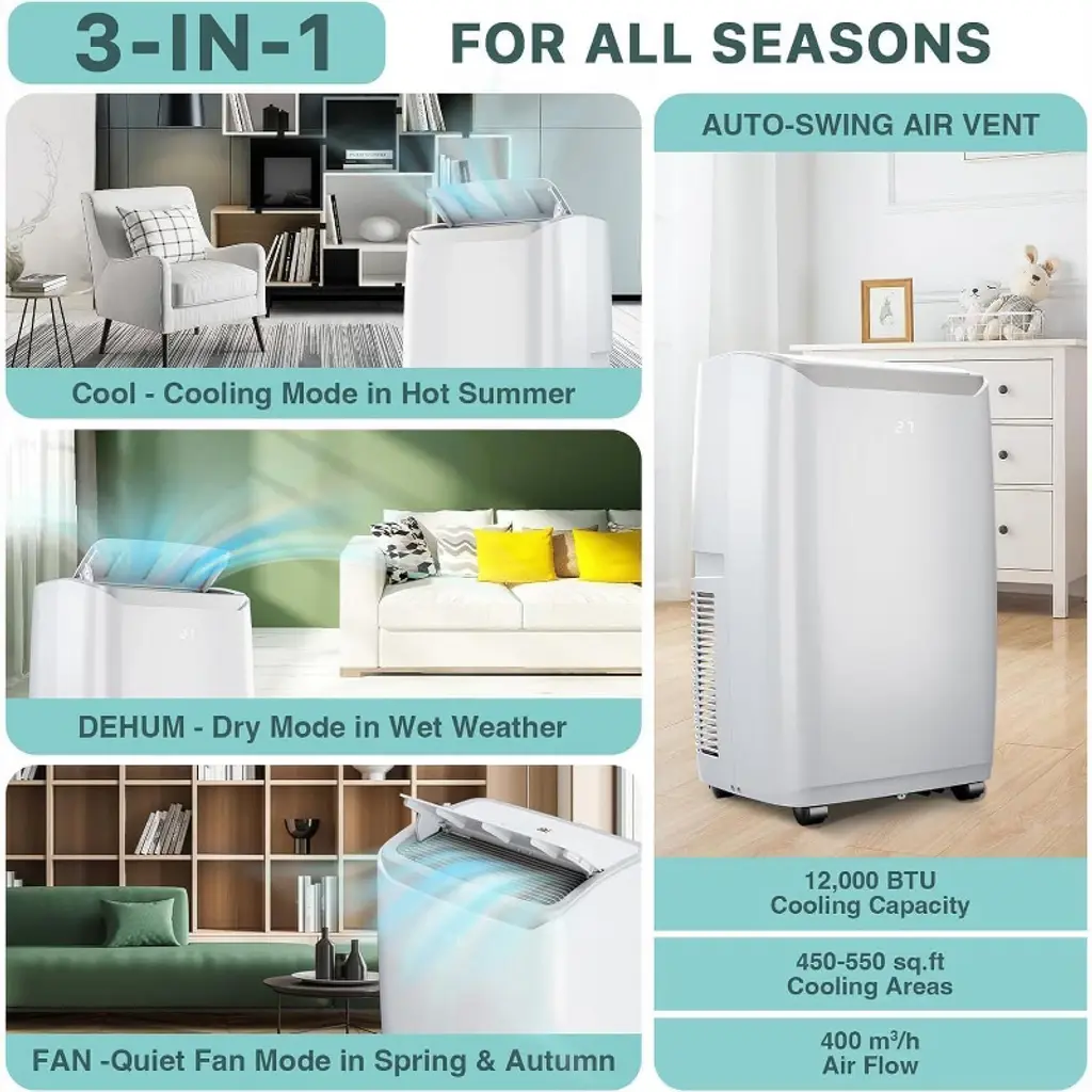 Acekool 12000 Btu Portable Air Conditioner, 3-in-1 Ac With Dehumidifier & Fan, Energy-saving, Easy Mobility, Window Kit, For Medium Rooms