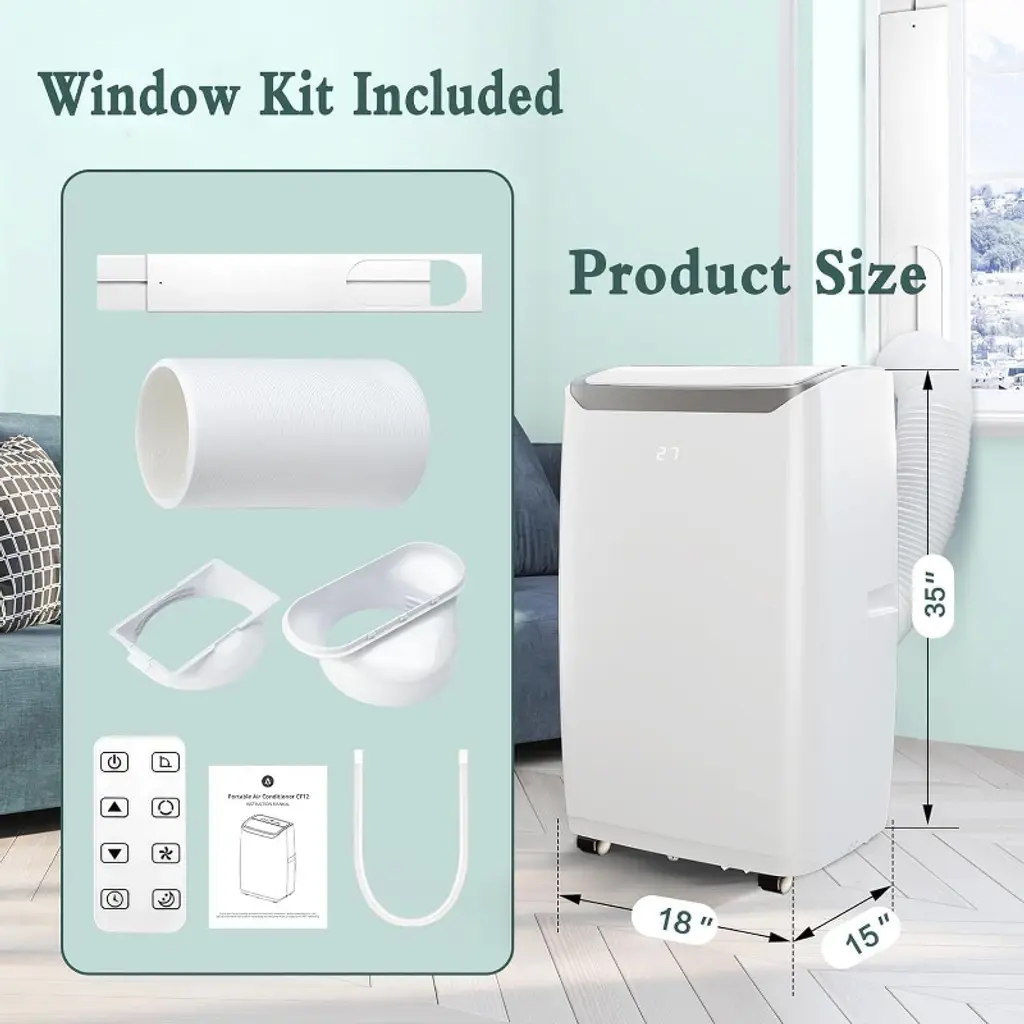 Acekool 12000 BTU portable air conditioner lets you enjoy efficient, personalized climate control for medium rooms up to 550 sq.ft. Its 3-in-1 design brings cooling, dehumidifier, and fan options together in one slim, easy-to-move unit—making it a solid choice for bedrooms, home offices, kitchens, or living rooms. Built-in wheels and a compact shape make it simple to transport from room to room, while the included window kit streamlines setup. Operation stays quiet for undisturbed sleep or study, and energy-saving features help you manage utility costs. Adjust temperature and mode using the LED panel or remote control, and keep the removable filter clean for optimal air quality. Unit measures about 13.8" W x 13" D x 28" H—a convenient fit for most home settings. Acekool provides simple, steady comfort for everyday living.