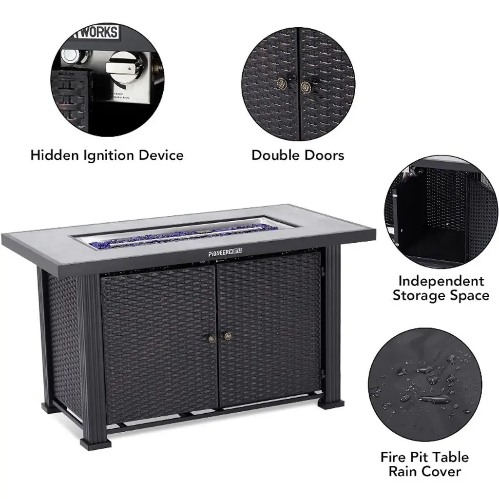 Acekool 44" Rectangular Propane Fire Table - 50,000 Btu Outdoor Firepit With Rain Cover & Dual Doors