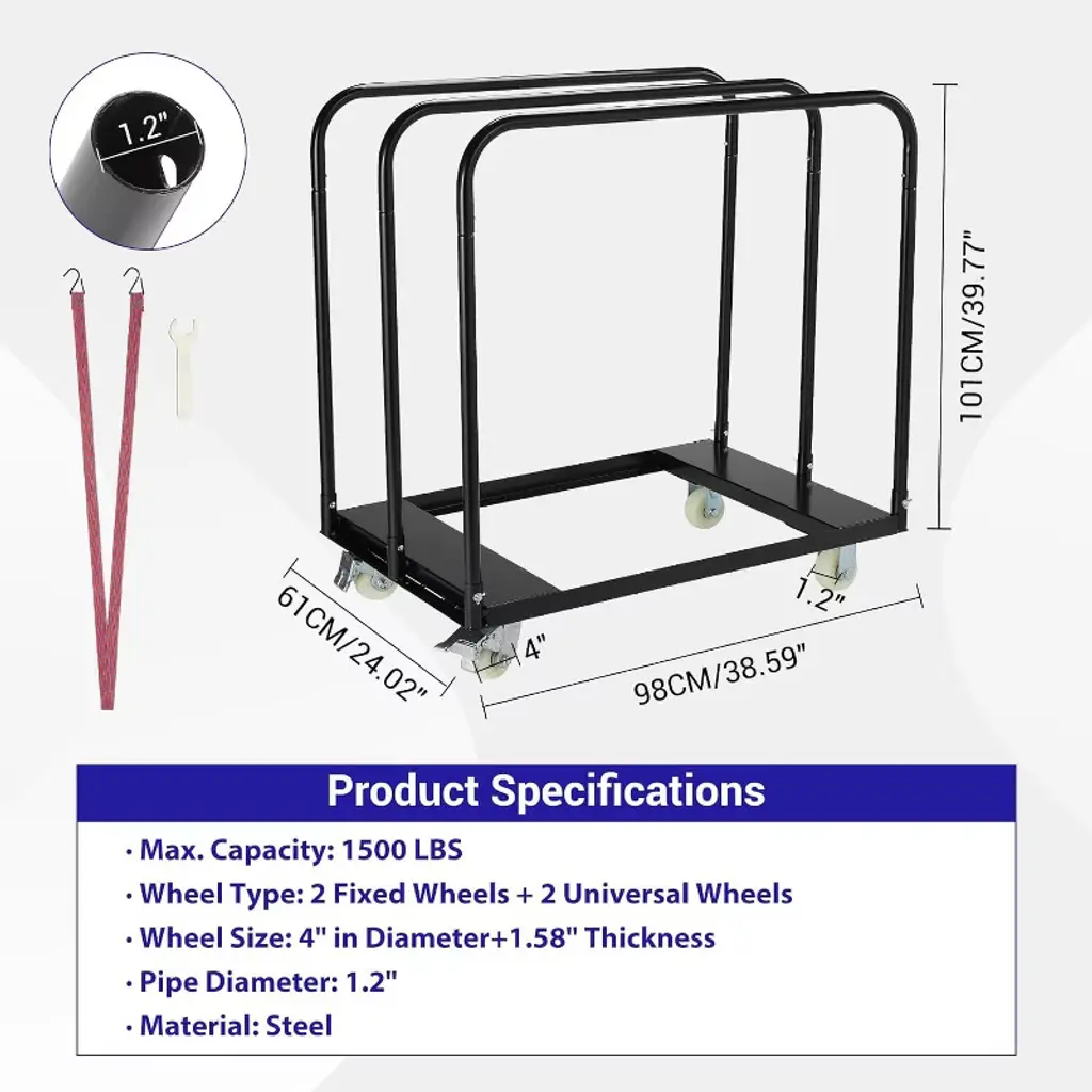Acekool Steel Drywall Cart, Heavy Duty Panel Truck With 1500 Lbs Capacity, 4 Silent Wheels, Platform Utility Cart For Panels, Lumber, Tables