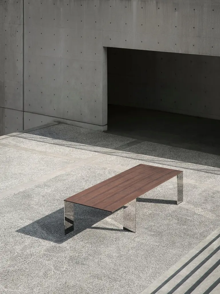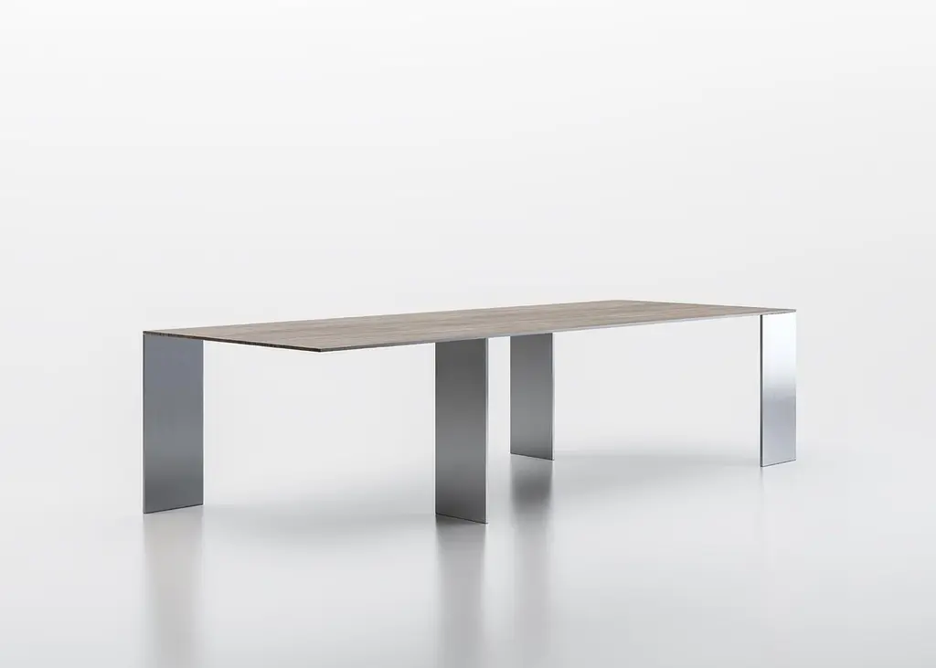 Table with extra-thin top, made of composite material veneered with precious woods, or in lacquered glass, supported by legs, placed onto opposite perpendicular axes. Wood top thickness mm 14, glass top in back-lacquered extraclear glass thickness mm 12 tempered. Supporting metal frame painted slate grey color.Top finishing:- Wooden top: lauro preto, brown oak, thermo-treated Eucalyptus, Black Eucalyptus, swamp oak, swamp ash.- Glass top: back-lacquered glass in white, black, warm grey or frosted white (frosted finish with superficial acid-etching)Legs finishing:- reflecting polished stainless steel legs- brushed burnished steel legsDimensions cm. 240x100 oder cm. 295x110, square cm. 160x160.Gabriele Buratti, architect and professor of Interior Design at the Faculty of Design of Politecnico di Milano, and Oscar Buratti, architect, form the architecture and design studio Buratti Architetti.Additional Information:Material: Wood, SteelTop finish: Eucalyptus ES48Frame finish: Burnished brushed steel MT02Dimensions: 240 W x 100 D x 72 H cmAvailable in other top finish options: Black eucalyptus ES47, Swamp ash ES57, Dark stained walnut ES59, White lacquered glass VT01, White lacquered frosted glass VT02, Warm grey lacquered glass VT04, Black lacquered glass VT03Available in other frame finish option: Shiny steel MT01Available in other size option: LargeAvailable in other various options