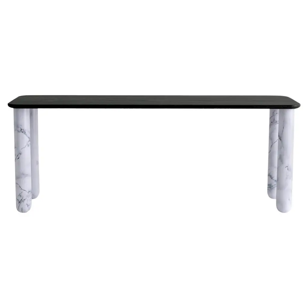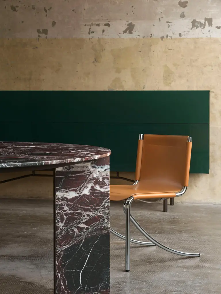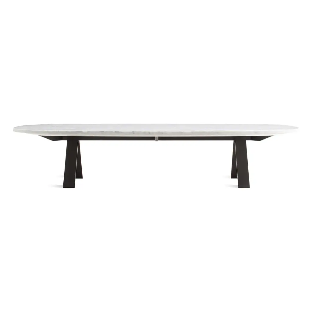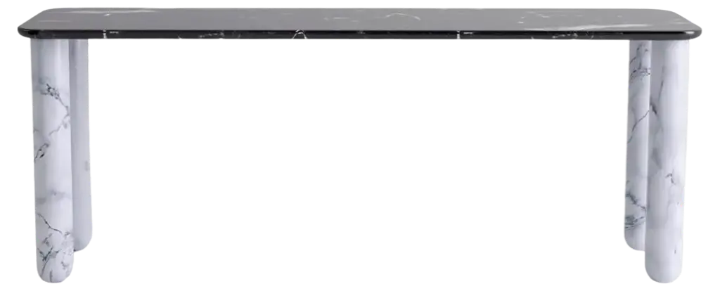 Large table, made of stone and metal. Top of stone thick cm 2 with tapered edges, divided into sections, supported by a wooden panel. Particularly shaped legs with a ''V'' section made of an innovative and contrasting material combination of stone with a structural metal core. Frame, inner legs and top-support in slate grey finish.Rotating tray ''Lazy Susan'', made of stone thick cm. 2 diam. cm 90, available as optional accessory.Stones: Arabescato Grey, Grafite Grey, Arabescato WhiteMarble natural matt or polished finishing, unprotected. Glossy polyester finishing available on request.Important:Stone slabs of first choice, carefully matched from the same block, without necessary granting of the continuity of the grains. Any differences in the texture, grains, color, or the presence of natural cracks filled with resin are natural attributes that can not be the cause of a claim.Born on 13 November 1957, Massimo Castagna graduated in architecture in 1984 from Milan Politecnico; he began his professional activities in 1986, founding the studio AD architettura. He has gained considerable professional experience in the field of architecture, interior design, art direction and design in the furnishing sector. One of his major creations has been the “Piramide” laboratory the Everest-K2-CNR scientific committee for the Italian National Research Council, which was built in Nepal beginning in 1991 at an altitude of 5050 m., to be used as a high-altitude research laboratory, a project selected for the 18th Milan Triennale.Additional information:Material: MarbleTop/ Base Finish: Matt white arabesque marble MR02Dimensions: 300 W x 125 D x 75 H cmAvailable in other top/base finish options: Matt Levanto red marble MR06, Matt Alpi Green marble MR07Available in other size options: 200x200, 125x240, Ø180, Ø200