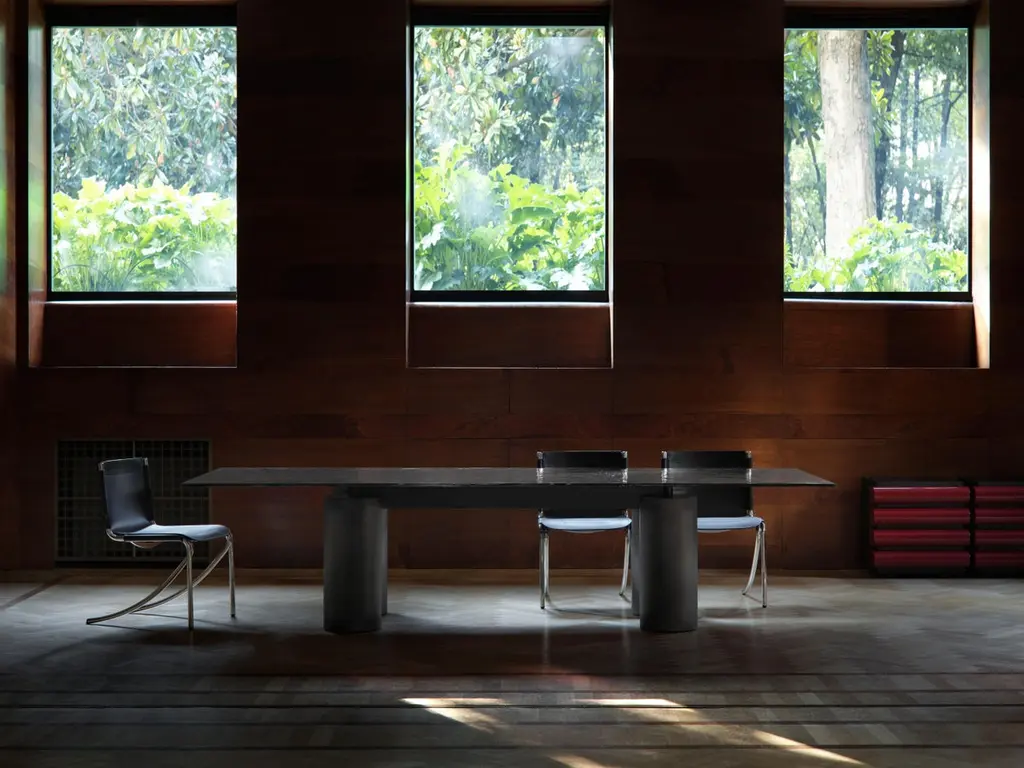 System of tables with glass tops supported by imposive columns in Fresco finish, a precious materical compund of concrete with special resins and pigments. diameter in different fine materials: Fresco finish (cement paste with special resins and pigments), shiny reflective stainless steel. Tops in transparent or extra-clear opalescent glass 15mm thick or transparent tempered grey glass 12mm. Frame made of grey painted micaceous metal.Special requests for non-standard size tables or for use in boardrooms or offices, made also of modules that can be composed or made to measure.Finishing of the legs:- Fresco finish: white, light grey or dark grey.Lella and Massimo Vignelli are a husband-and wife team. They studied in Venice, ltaly, and in 1960 established the Massimo and Lella Vignelli Office of Design and Architecture in Milan, working with graphics, products, furniture and interiors. In 1965 they founded Unimark lnternational Corporation, and, in 1971, Vignelli Associates, with an office in New York and liaison offices in Paris and Milan. The Vignellis’ work has been awarded numerous prizes and exhibited several times in sector publications, in the United States and abroad. Several of his works are included in the permanent collections of several museums.Additional Information:Material: Glass, steelTop finish: Transparent glass VT17Frame finish: Micaceous grey paintedBase finish: Matt painted gunmetal MT13Dimensions: 200 W x 200 D x 72 H cmAvailable in other top finish options: Extra clear opalescent glass VT05, Black cast glass VT18Available in other base finish options: White encaustic EN01, Terracotta encaustic EN03, Matt painted orbital bronze MT14, Green encaustic EN02Available in other size options: 250x120, 300x120, 350x120, 160x160, 180x180 cmAvailable in other various options