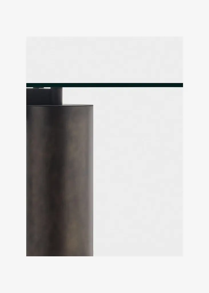 System of tables with glass tops supported by imposive columns in Fresco finish, a precious materical compund of concrete with special resins and pigments. diameter in different fine materials: Fresco finish (cement paste with special resins and pigments), shiny reflective stainless steel. Tops in transparent or extra-clear opalescent glass 15mm thick or transparent tempered grey glass 12mm. Frame made of grey painted micaceous metal.Special requests for non-standard size tables or for use in boardrooms or offices, made also of modules that can be composed or made to measure.Finishing of the legs:- Fresco finish: white, light grey or dark grey.Lella and Massimo Vignelli are a husband-and wife team. They studied in Venice, ltaly, and in 1960 established the Massimo and Lella Vignelli Office of Design and Architecture in Milan, working with graphics, products, furniture and interiors. In 1965 they founded Unimark lnternational Corporation, and, in 1971, Vignelli Associates, with an office in New York and liaison offices in Paris and Milan. The Vignellis’ work has been awarded numerous prizes and exhibited several times in sector publications, in the United States and abroad. Several of his works are included in the permanent collections of several museums.Additional Information:Material: Glass, steelTop finish: Transparent glass VT17Frame finish: Micaceous grey paintedBase finish: Matt painted gunmetal MT13Dimensions: 180 W x 180 D x 72 H cmAvailable in other top finish options: Extra clear opalescent glass VT05, Black cast glass VT18Available in other base finish options: White encaustic EN01, Terracotta encaustic EN03, Matt painted orbital bronze MT14, Green encaustic EN02Available in other size options: 250x120, 300x120, 350x120, 160x160, 200x200 cmAvailable in other various options
