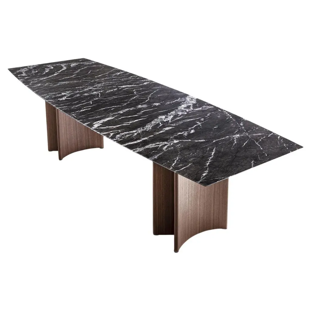 Large table, made of stone and metal. Top of stone thick cm 2 with tapered edges, divided into sections, supported by a wooden panel. Particularly shaped legs with a ''V'' section made of an innovative and contrasting material combination of stone with a structural metal core. Frame, inner legs and top-support in slate grey finish.Rotating tray ''Lazy Susan'', made of stone thick cm. 2 diam. cm 90, available as optional accessory.Stones: Arabescato Grey, Grafite Grey, Arabescato WhiteMarble natural matt or polished finishing, unprotected. Glossy polyester finishing available on request.Important:Stone slabs of first choice, carefully matched from the same block, without necessary granting of the continuity of the grains. Any differences in the texture, grains, color, or the presence of natural cracks filled with resin are natural attributes that can not be the cause of a claim.Born on 13 November 1957, Massimo Castagna graduated in architecture in 1984 from Milan Politecnico; he began his professional activities in 1986, founding the studio AD architettura. He has gained considerable professional experience in the field of architecture, interior design, art direction and design in the furnishing sector. One of his major creations has been the “Piramide” laboratory the Everest-K2-CNR scientific committee for the Italian National Research Council, which was built in Nepal beginning in 1991 at an altitude of 5050 m., to be used as a high-altitude research laboratory, a project selected for the 18th Milan Triennale.Additional information:Material: MarbleTop/ Base Finish: Matt white arabesque marble MR02Dimensions: Ø 200 x 75 H cmAvailable in other top/base finish options: Matt Levanto red marble MR06, Matt Alpi Green marble MR07Available in other size options: 200x200, 125x240, 125x300, Ø180