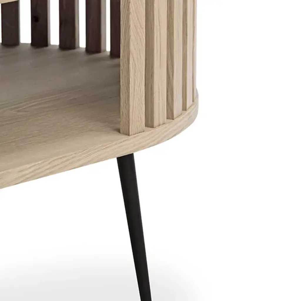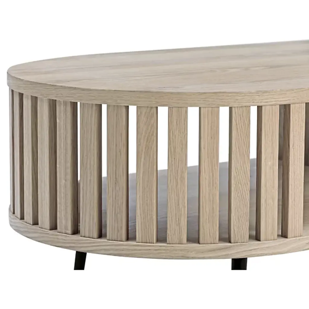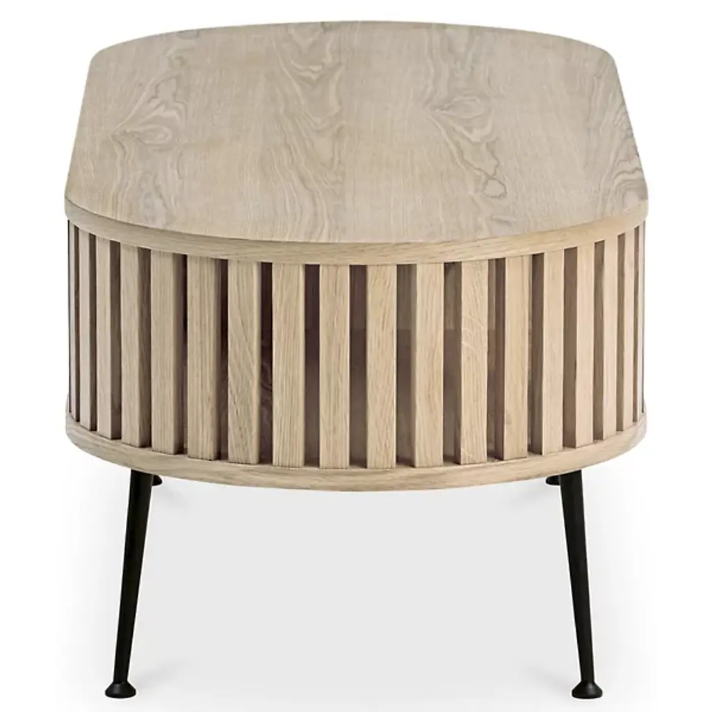 The Adair Coffee Table from Huxe features solid oak construction with a light oil finish and oak veneer detailing that showcases the wood's natural grain variations. The gently rounded form features gated paneling that conceals spacious storage areas underneath, perfect for magazines, remotes, or seasonal items. Sturdy steel legs provide reliable support while maintaining the piece's clean midcentury lines and 1950s-inspired aesthetic. This coffee table works as a living room centerpiece for entertaining, or in family rooms where hidden storage keeps everyday items organized with style.