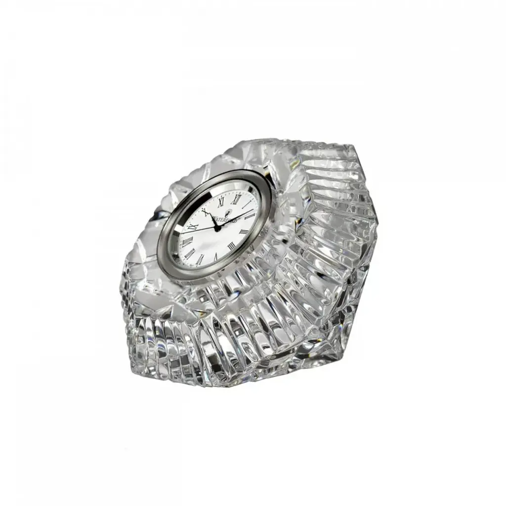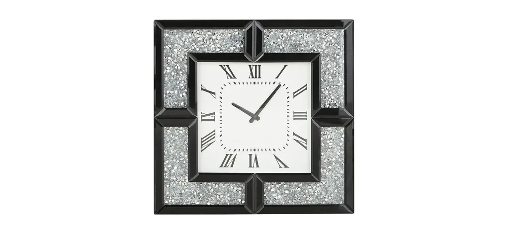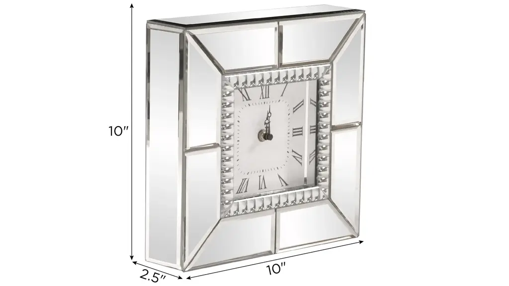 The Adele Table Clock features a square mirrored frame that offers the most amazing reflections of light and color. Each mirrored panel has a small bevel adding to its beauty and style. The piece is then trimmed in a beaded glass border. The clock face features Roman Numerals and slim black hands. The clock uses AA batteries that are not included.