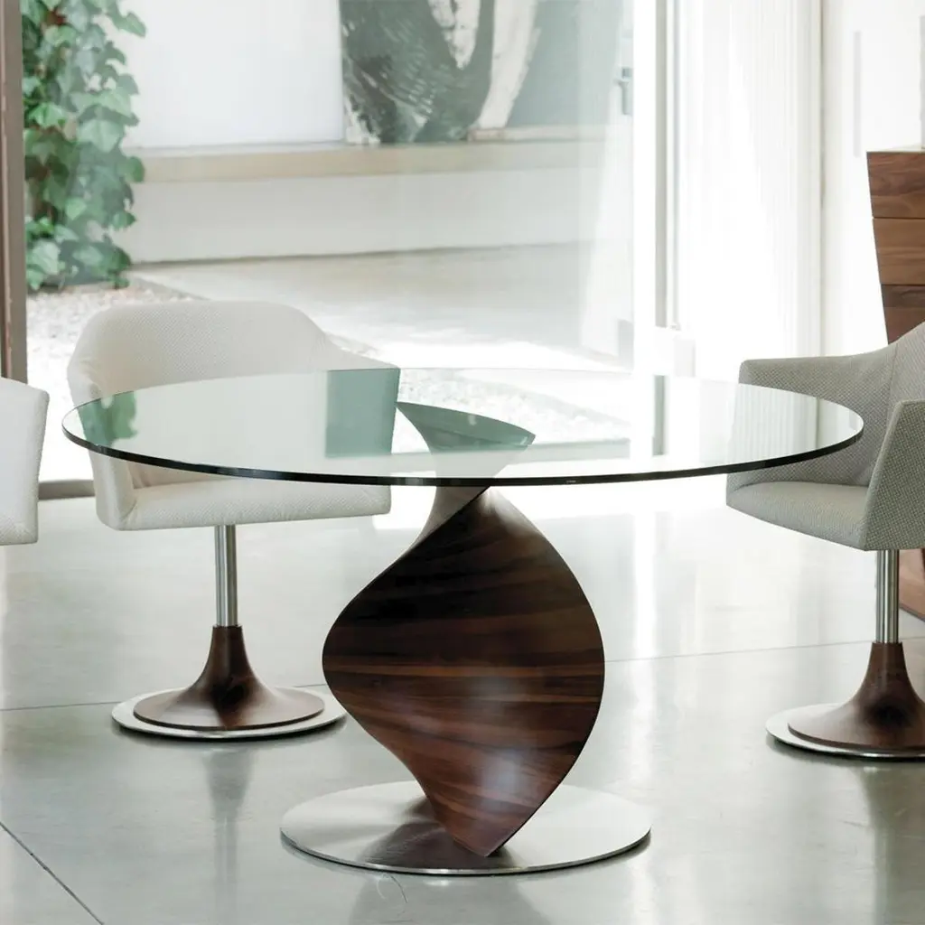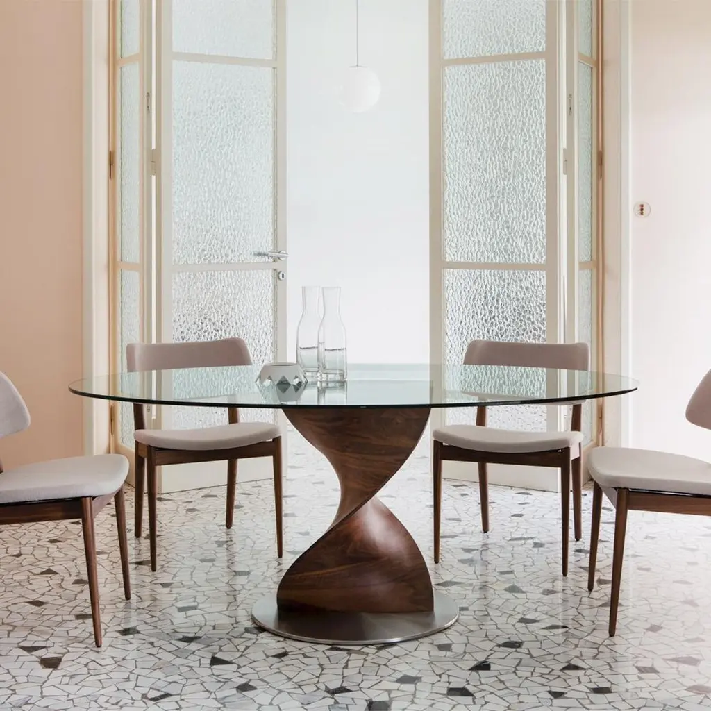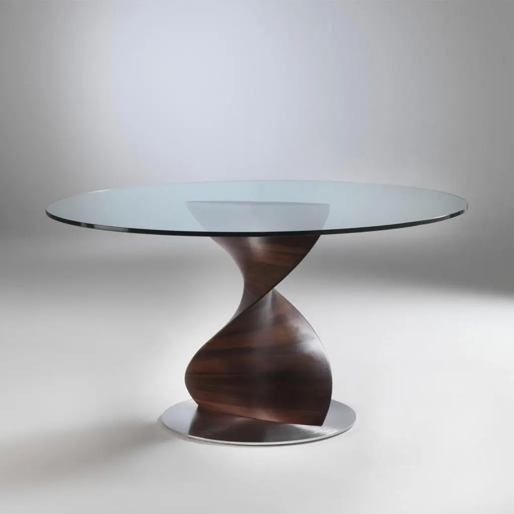 Table ADN round with base hand carved in solidpolished walnut wood. With Tempered glass top,12mm thickness. Base dimensions: Diameter 66cm x height 74cm.Available on request in:Diameter 130cm x height 74.5cm, price: 16500,00€.Diameter 140cm x height 74.5cm, price: 16900,00€.Diameter 150cm x height 74.5cm, price: 17500,00€.Diameter 160cm x height 74.5cm, price: 17900,00€.Also available with black or white lacquered base, on request.