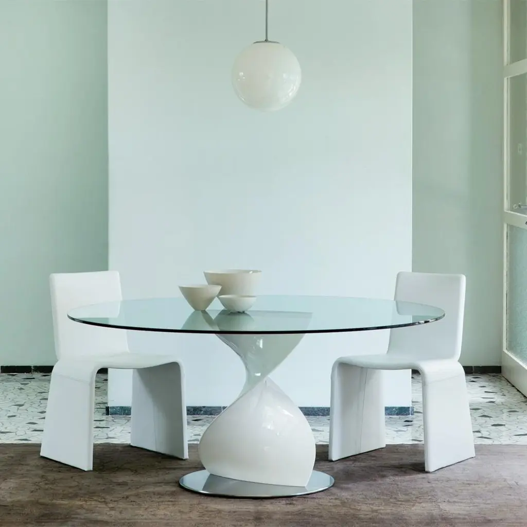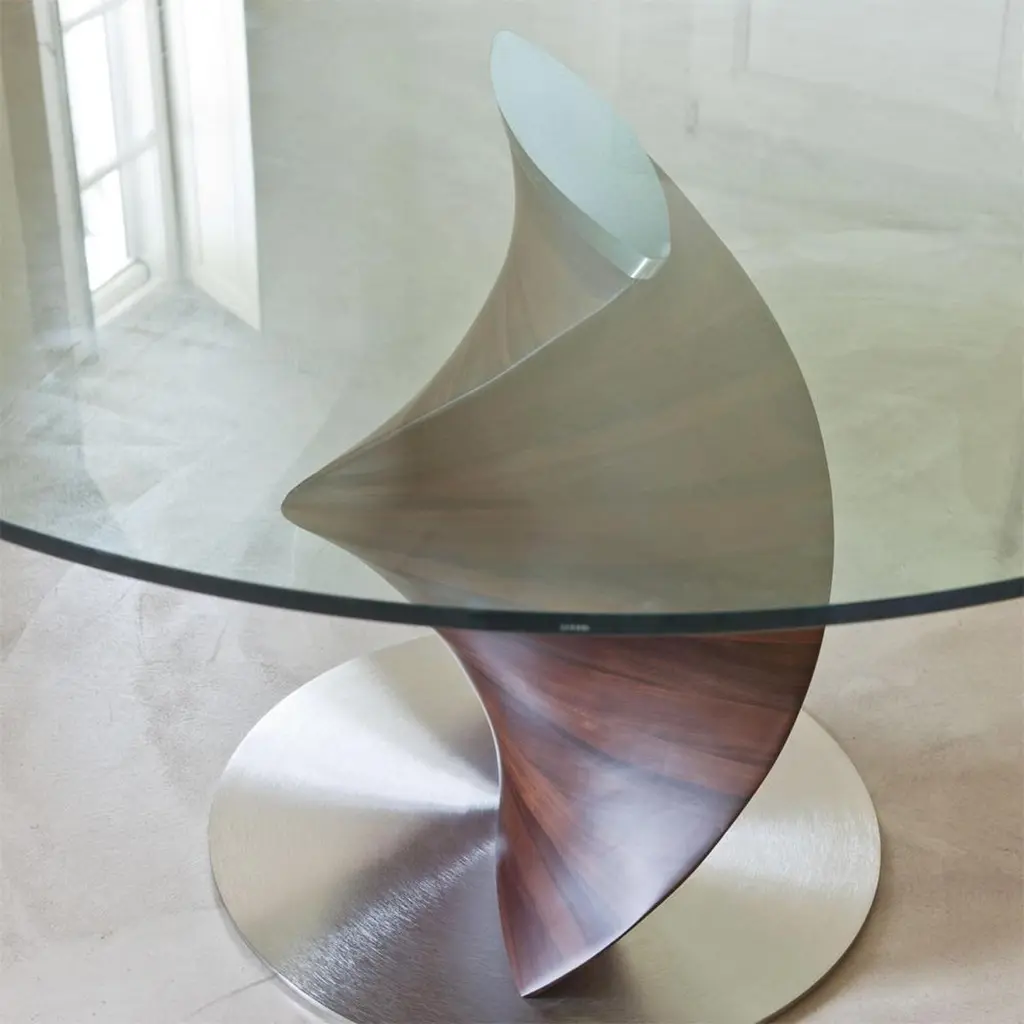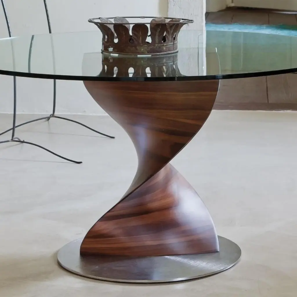 Table ADN round with base hand carved in solidpolished walnut wood. With Tempered glass top,12mm thickness. Base dimensions: Diameter 66cm x height 74cm.Available on request in:Diameter 130cm x height 74.5cm, price: 16500,00€.Diameter 140cm x height 74.5cm, price: 16900,00€.Diameter 150cm x height 74.5cm, price: 17500,00€.Diameter 160cm x height 74.5cm, price: 17900,00€.Also available with black or white lacquered base, on request.