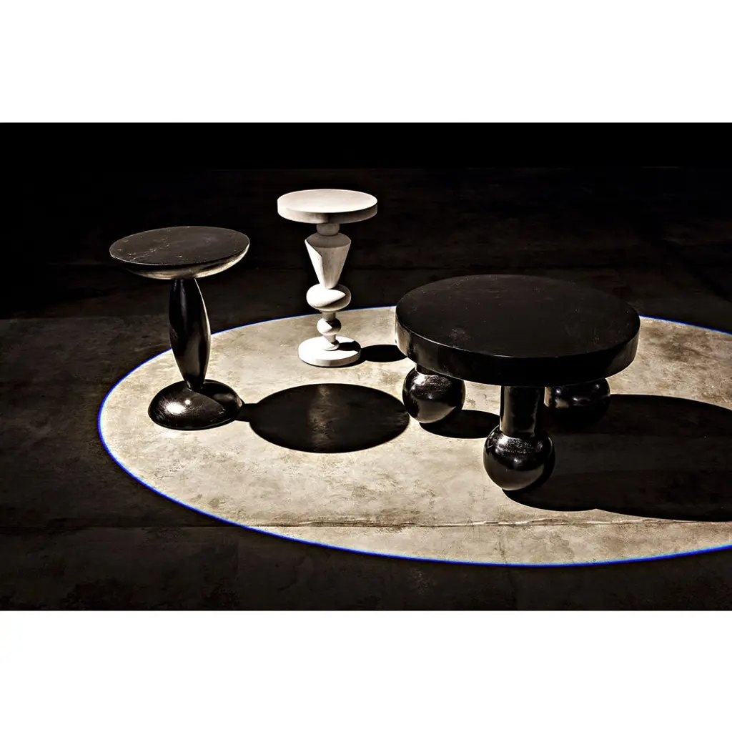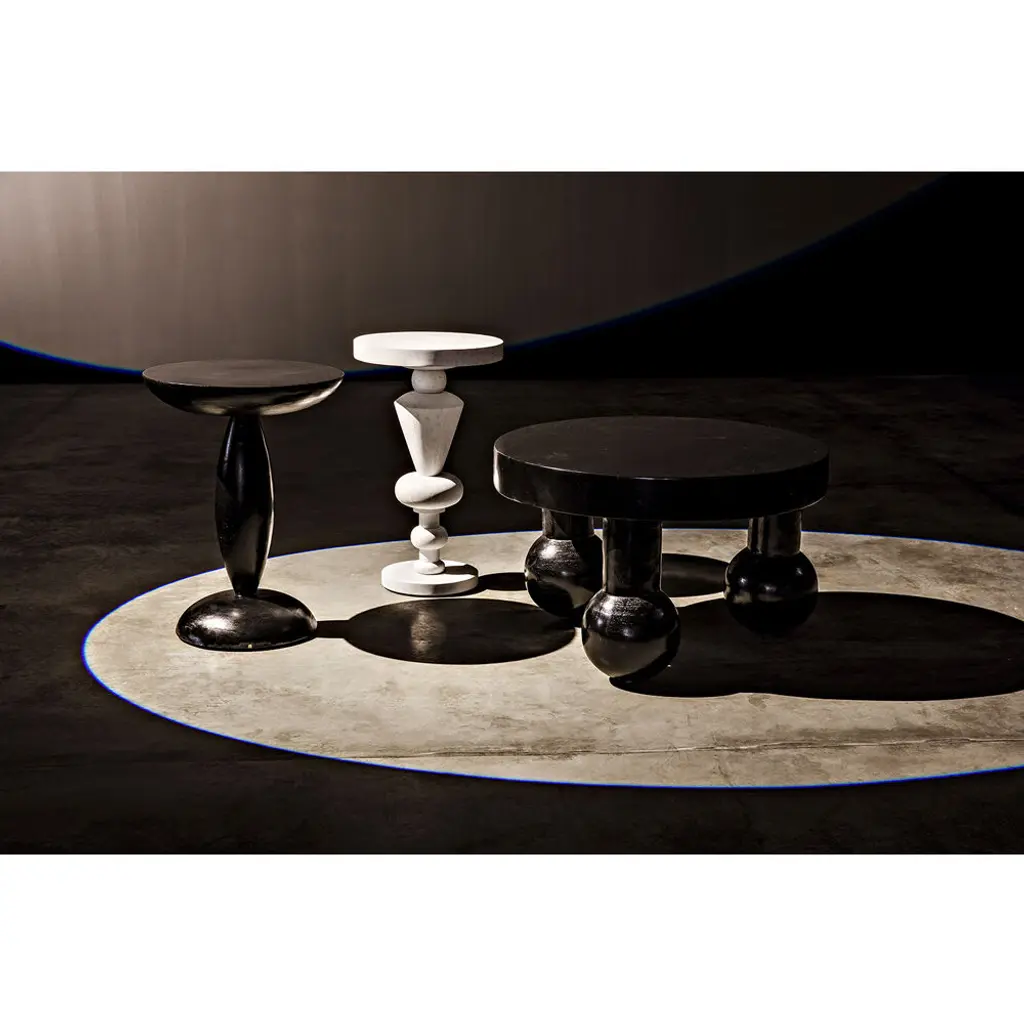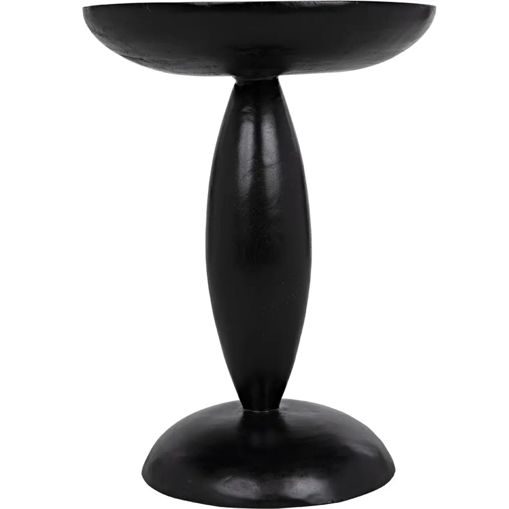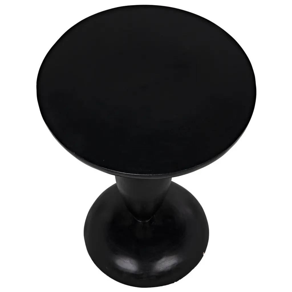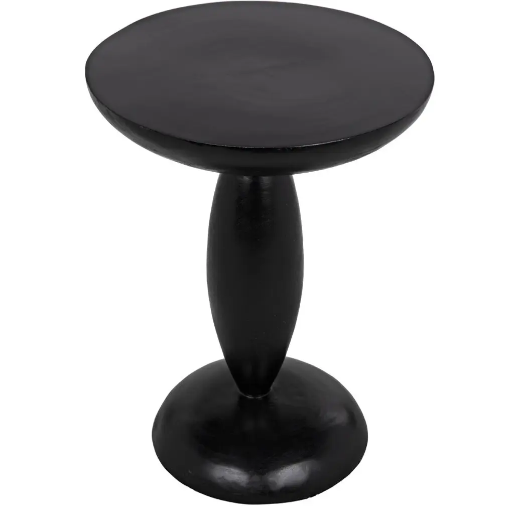 This sophisticated side table has been expertly hand-carved of solid mahogany with a hand-rubbed black finish. Its circular top is mirrored by a smaller round base a sensuously carved leg connects the two.