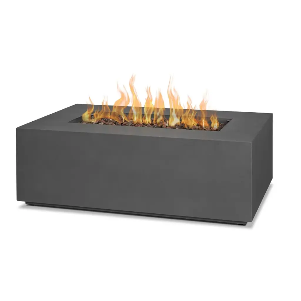 The Aegean gas fire table is a welcome addition to most outdoor living spaces. Adding warmth and a relaxing ambience for any occasion. Available in mist gray or weathered slate and in multiple sizes, the steel table is finished with powered-coated paint for added weather resistance. The Aegean comes complete with a steel lid for increased functionality, red lava rock, a polyester protective cover, and can be converted to Natural gas by a Certified Gas Technician with the conversion kit that is included with the table. Enhance the look of your table with optional accessories like a propane tank cover, gas hose cover, and Real Flame fire glass.