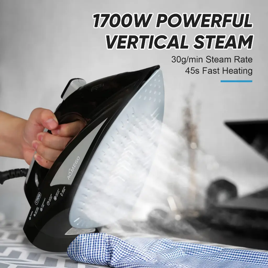 Iron your clothes in half the time with Aemego’s Steam Iron. The ceramic soleplate and 21 steam holes work together to easily glide over all fabric types with even heating to eliminate wrinkles. Set the steam output along with iron temperature for the perfect press every time. In addition to traditional ironing, the Aemego steam iron can be used as a vertical steamer for hanging items. And the anti-drip design ensures that water will not leak onto your clothes. Aemego’s 1700-watt iron is long lasting thanks to the anti-calcium function that filters water to prevent accumulation. The steam iron also include 3-way automatic shut-off so you never have to worry about your clothes or home. Perfectly press and remove wrinkles from every fabric with Aemego.