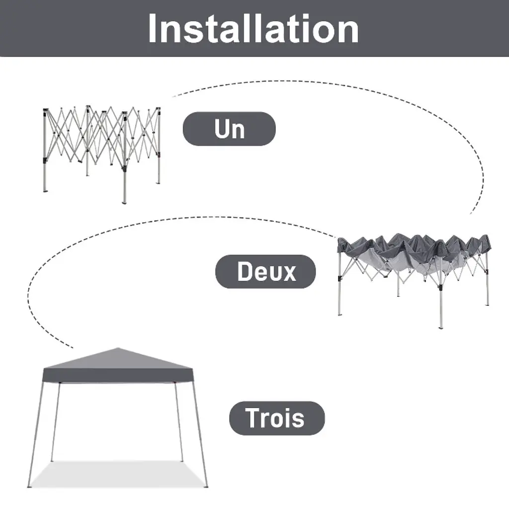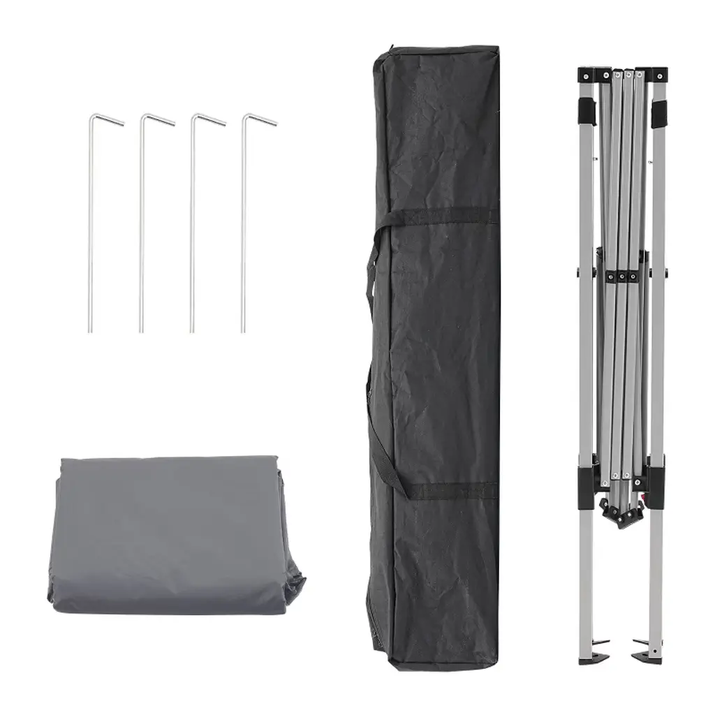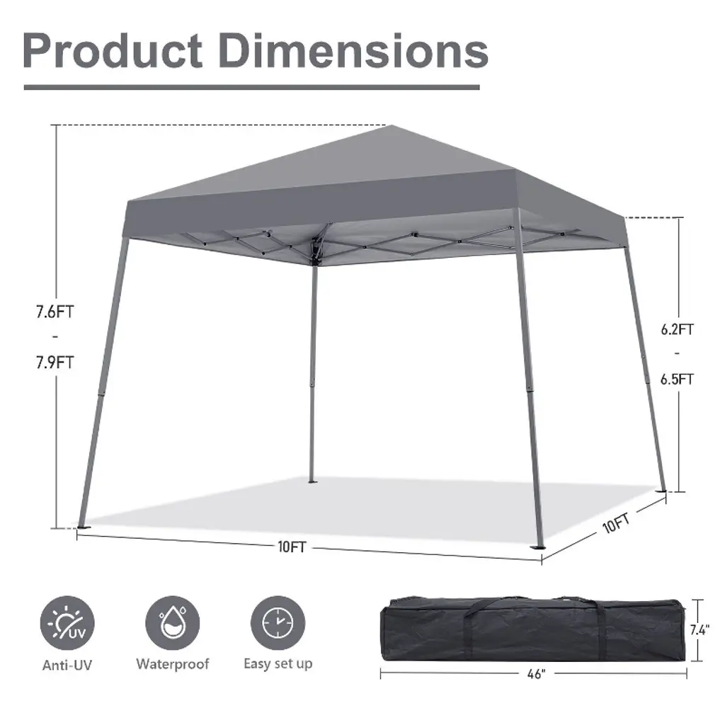 Color:Dark grey Frame Finish: Silver grey Frame Material: Metal Steel Canopy top dimension 8ft x 8 ft; Canopy base dimension:10ft x 10 ft; Top eight: 8 ft(Top to the ground) ; Edge height:6.5ft(tent edge to the ground); Tent Cloth Material: 190D silver-plated Oxford cloth Carrying bag Material: 300D PE Oxford cloth