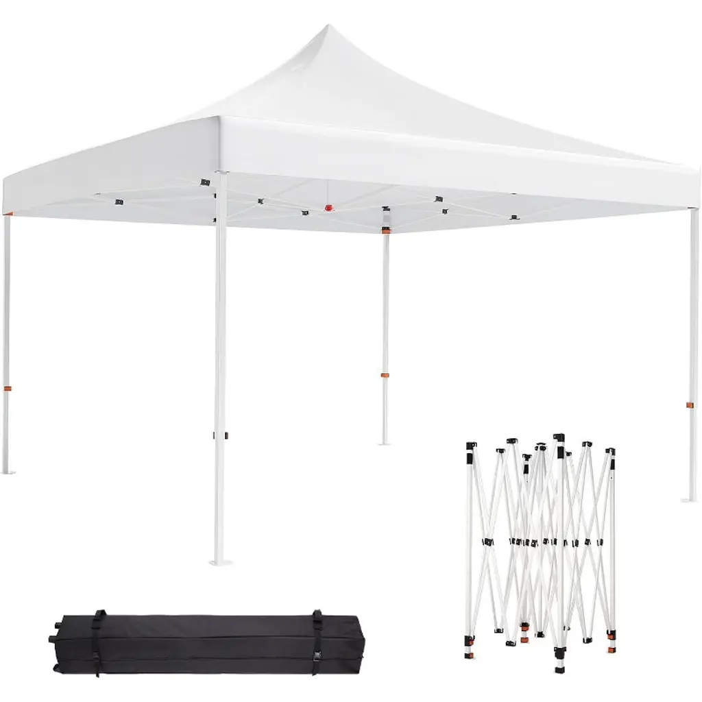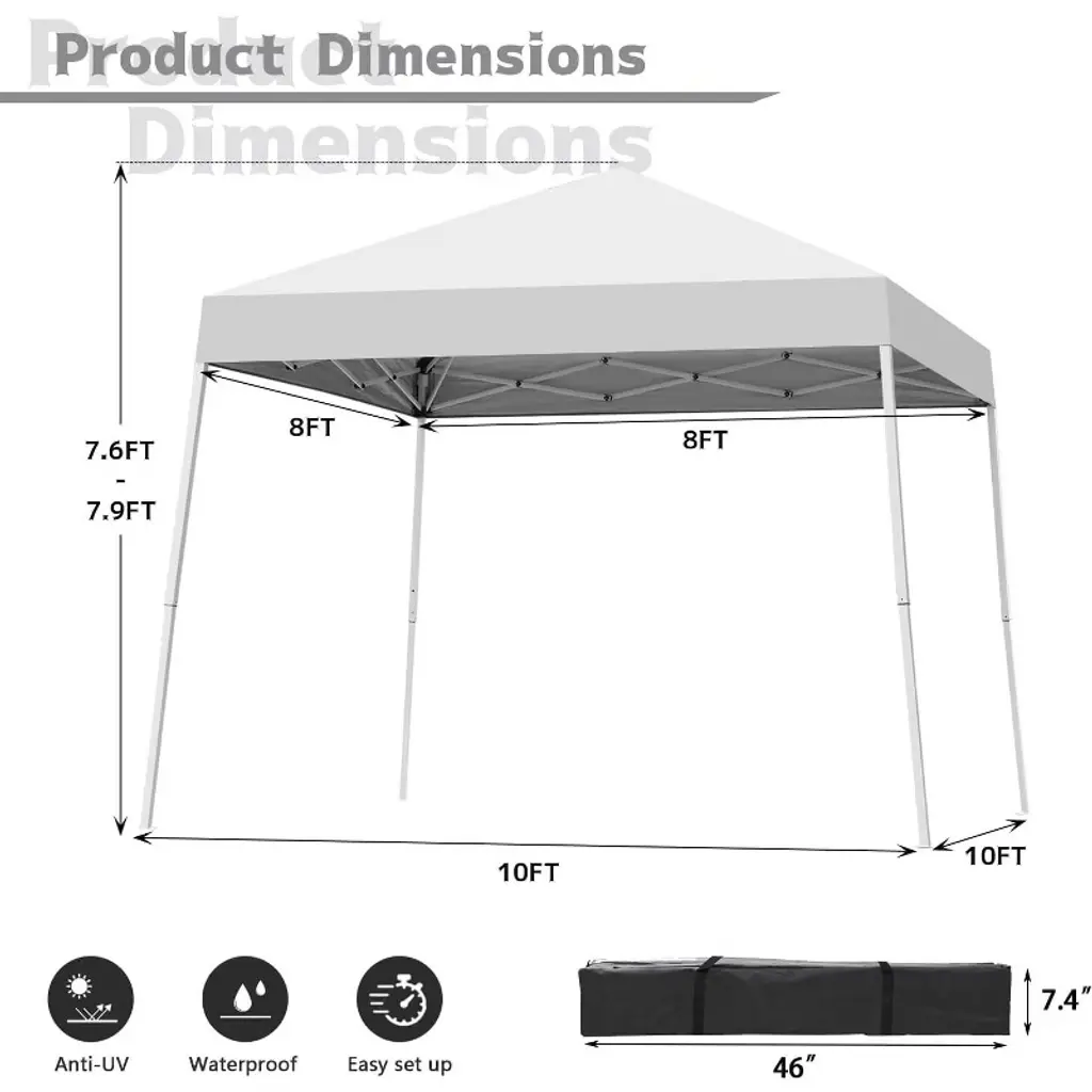 Color:White Frame Finish: Silver grey Frame Material: Metal Steel Canopy top dimension 8ft x 8 ft; Canopy base dimension:10ft x 10 ft; Top eight: 8 ft(Top to the ground) ; Edge height:6.5ft(tent edge to the ground); Tent Cloth Material: 190D silver-plated Oxford cloth Carrying bag Material: 300D PE Oxford cloth