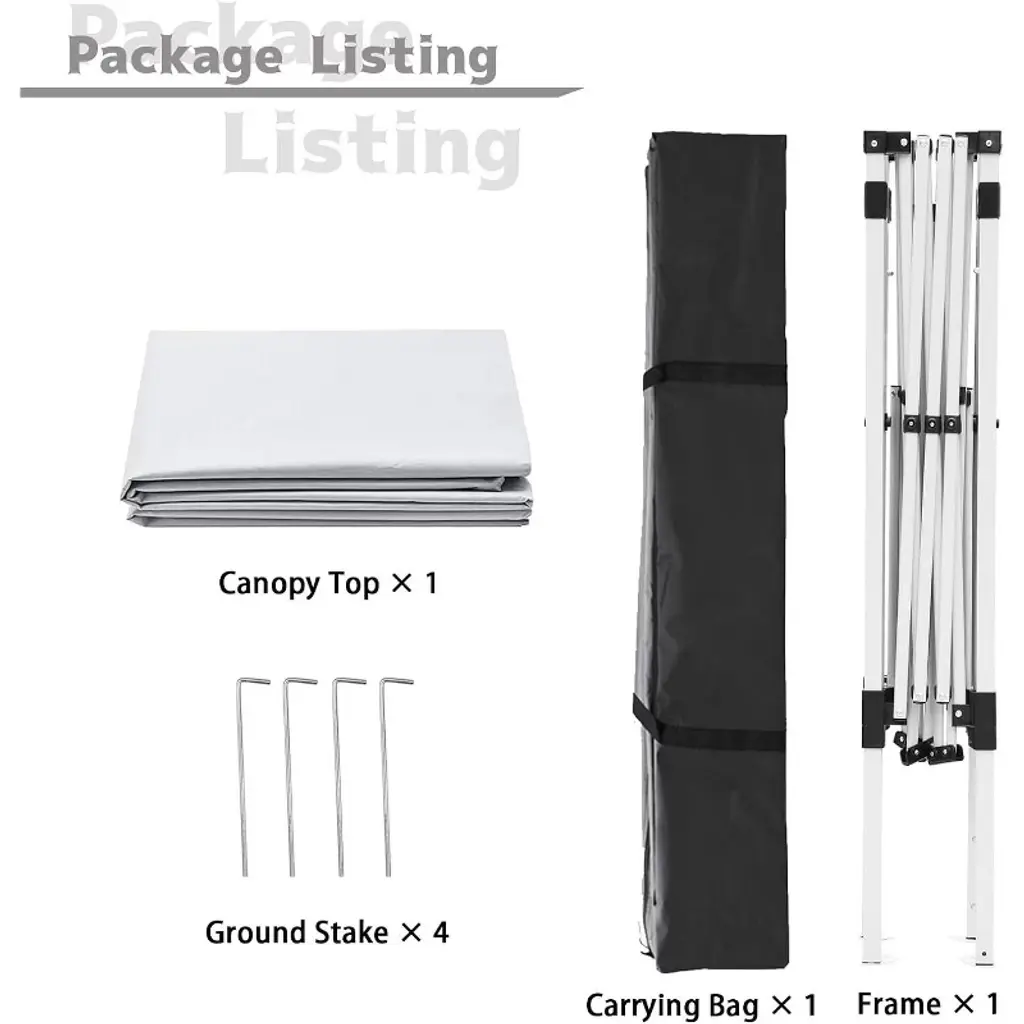 Color:White Frame Finish: Silver grey Frame Material: Metal Steel Canopy top dimension 8ft x 8 ft; Canopy base dimension:10ft x 10 ft; Top eight: 8 ft(Top to the ground) ; Edge height:6.5ft(tent edge to the ground); Tent Cloth Material: 190D silver-plated Oxford cloth Carrying bag Material: 300D PE Oxford cloth