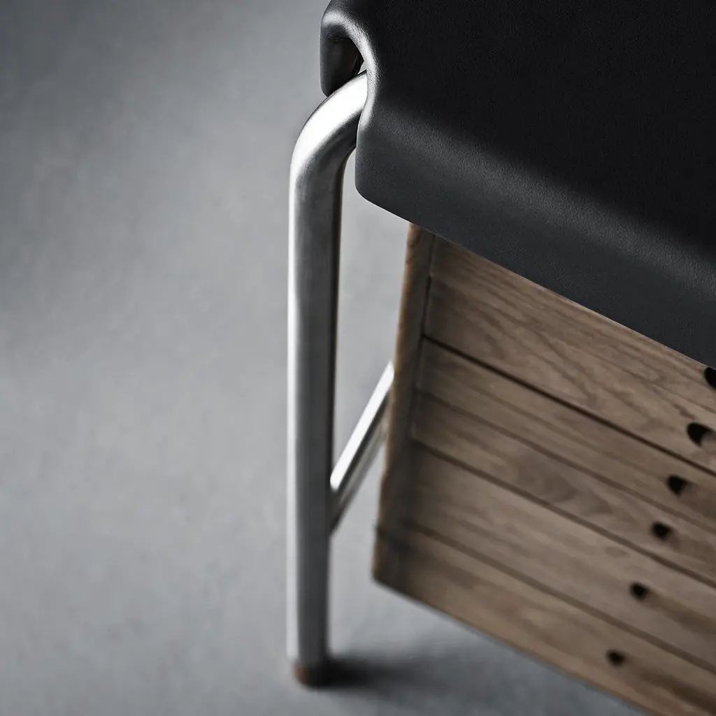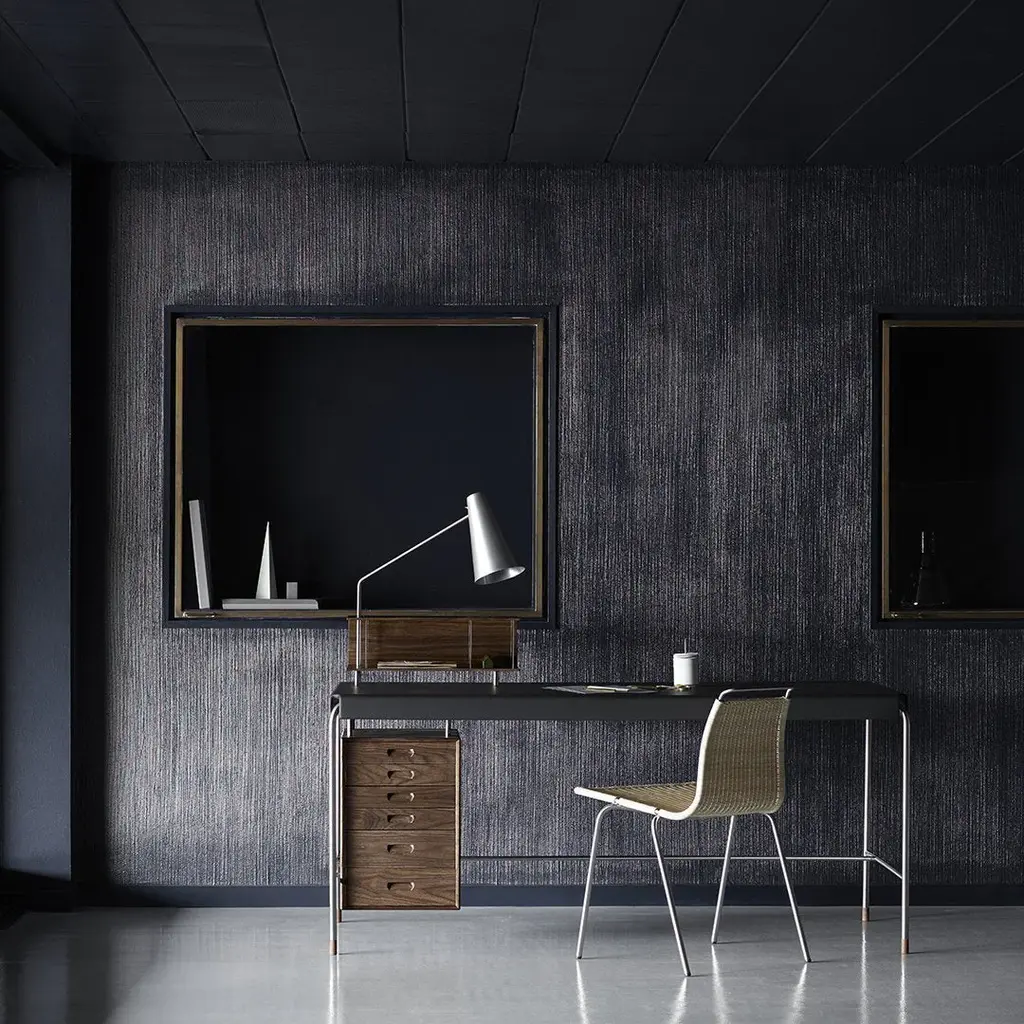 Arne Jacobsen designed the elegant AJ52 Society Table for the American-Scandinavian Foundation's new office in New York in 1952. Since then, this uncompromisingly modern desk has become a favorite of discerning design enthusiasts. The desk is made of solid wood, veneer and steel and the tabletop is covered with fine-structured leather that opens at the corners to expose the legs. The wooden shelf has two compartments with glass sides and the integrated lamp is made in brushed stainless-steel. Attached with four metal tubes, the drawer unit appears suspended beneath the table, adding to the overall impression of lightness. The elements create a sophisticated, modern and elegant work desk. The AJ52 Society Table is available in two sizes and the six-drawer unit can be mounted on either side of the desk. The Lamp module is sold separately. VIEW: AJ52 Lamp Module