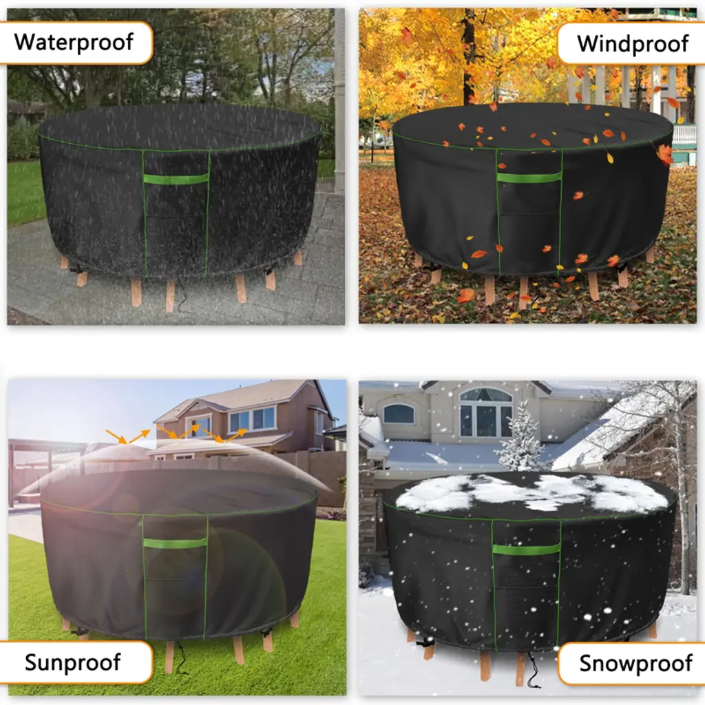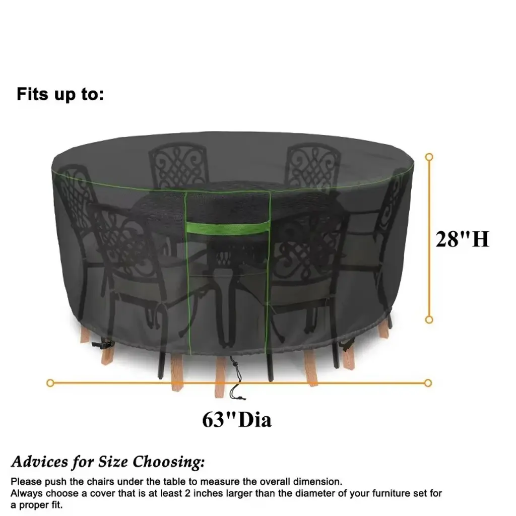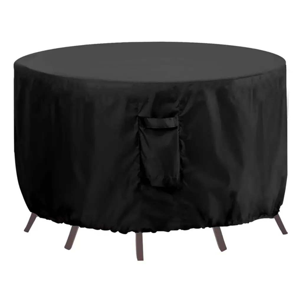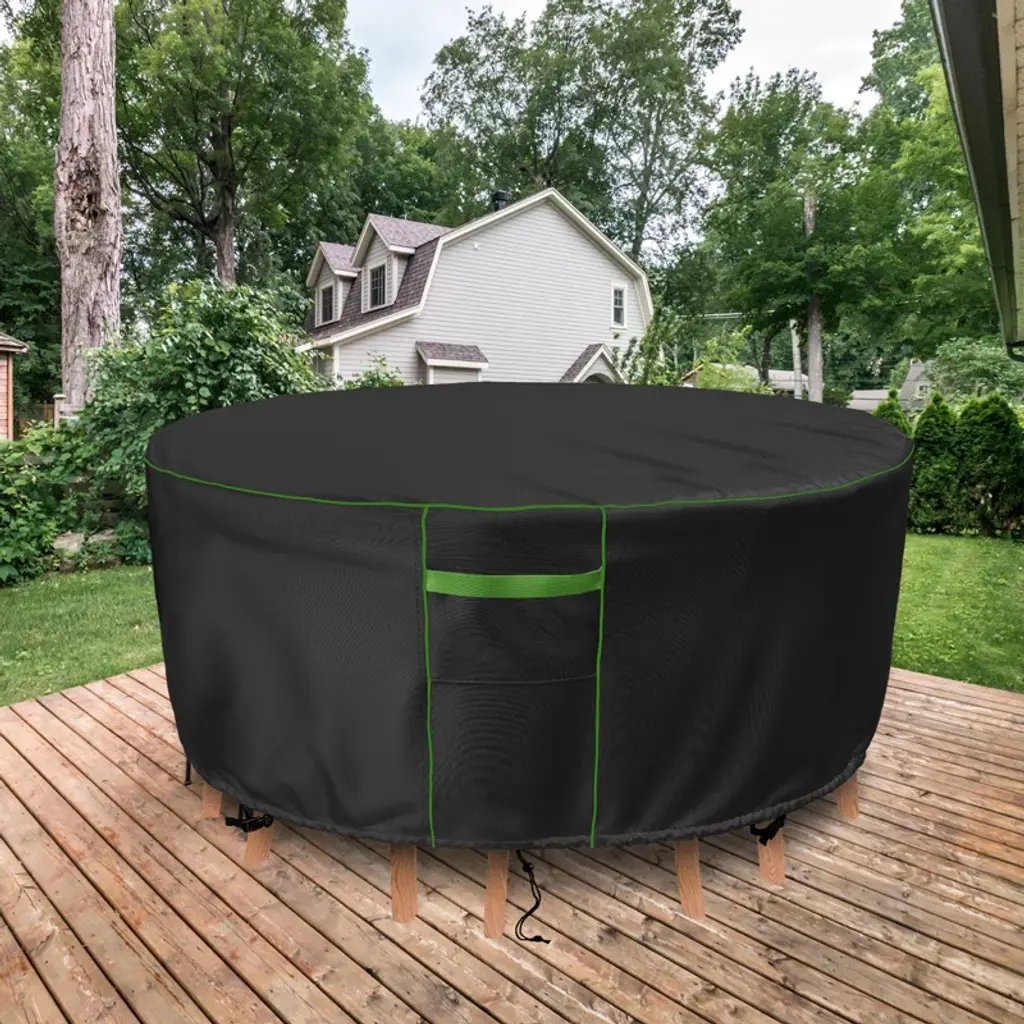 Keep your outdoor table protected in every season with the Akefit round patio table cover. Designed with a water-resistant inner layer and sealed top seams, it defends against rain, snow, sun, and dust. The classic black design is accented by stylish green piping, adding a clean look to your patio. Two built-in air vents reduce moisture and mildew, while the adjustable drawstring and corner buckles keep the cover secure even in strong winds. Convenient fabric handles make removal easy, and the hidden built-in storage pouch offers neat, compact storage when not in use.