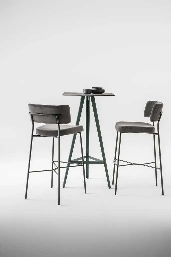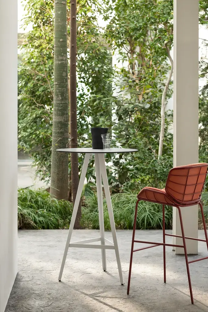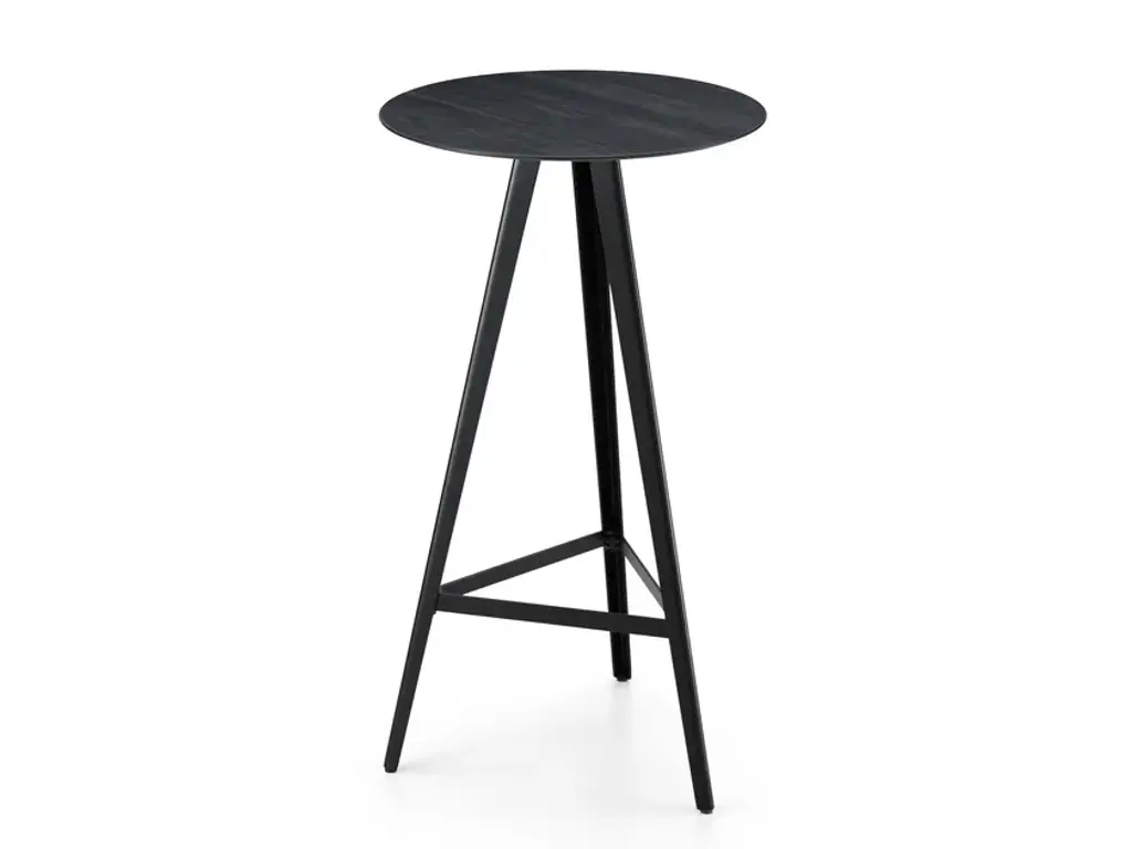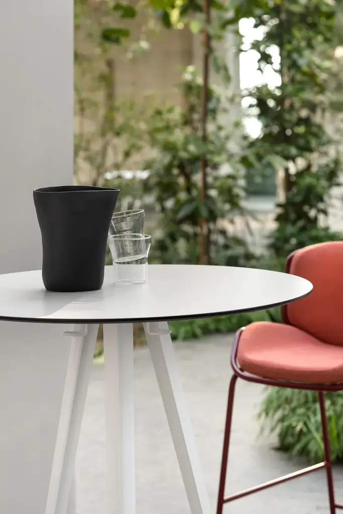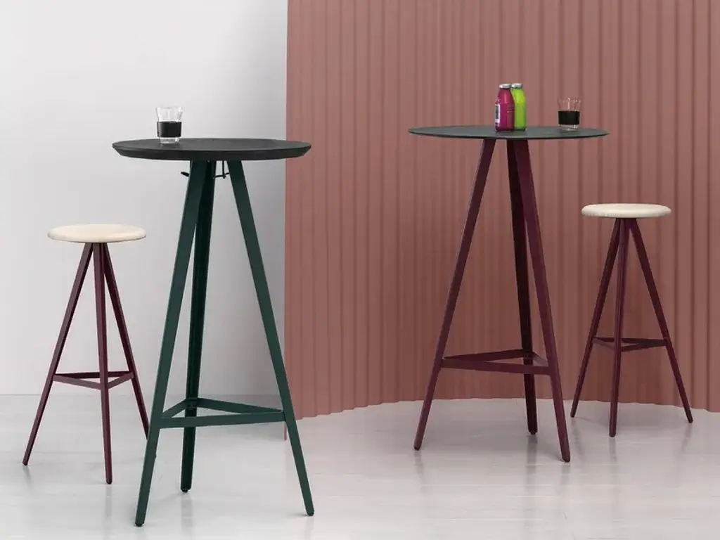 High table with painted metal base and round lacquered wood tabletop from the AKY collcetion, designed by Emilio Nanni.