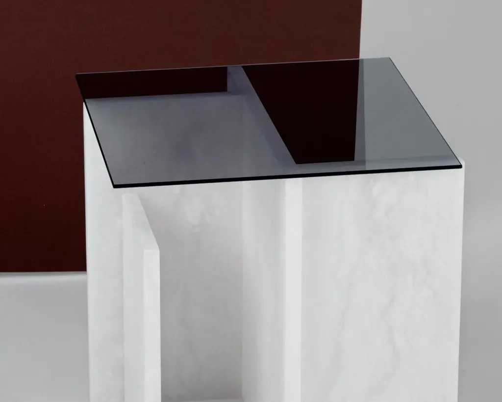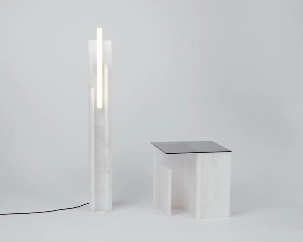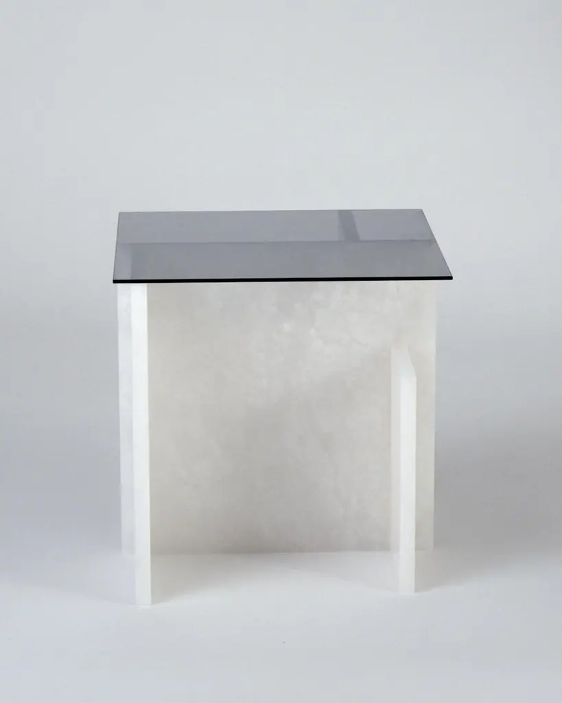 Alabaster table by OwlDimensions: D 40 x W 40 x H 40cmMaterials: Solid Alabaster.Alabaster is an evolving series in which alabaster is shaped into a functional play of vertical, geometric forms. The series has grown from early explorations with the material in our workshop, initiated by the desire to experiment with a material not commonly used in furniture today. Bringing in contemporary ways of working, the Alabaster series reduces the material to its raw essence while alluding to its rich history of ornament and sculpture.All pieces are handmade and built in our workshopOWL is a design studio based in Barcelona that designs and produces unique furniture and objects, mainly but not exclusively in wood, adaptable and scalable to meet the needs of each client, whether private or professional.Our designs are hand built in-house using high-quality materials from local suppliers. A practice that not only allows us to be conscious and sustainable, but also to create objects that stand the test of time. Additionally allowing us to offer a customization service that covers special and large-scale projects.