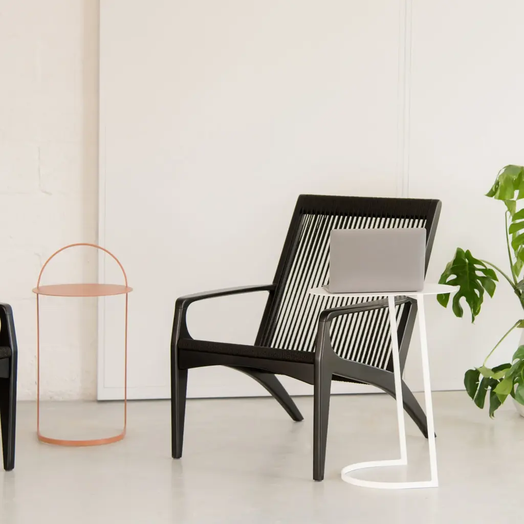 Elevate your lounging experience with the Alca Laptop Table from Sossego. Available in Black, White, Cypress, or Toasted Nut, this sleek and non-slip table easily slides over the arms of lounge chairs or sofas for a practical and industrial touch. Designed for simplicity and utility, it's the perfect accessory for your daily living. Highlights