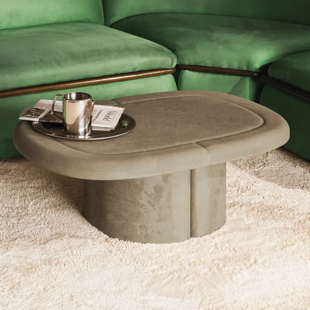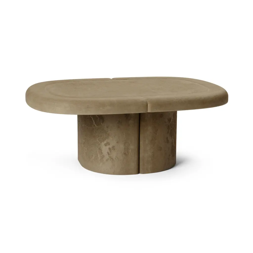 Patricia Urquiola stretches the Alder concept into a smooth-oval coffee table, letting Mater’s Matek® composite show off its stone-like calm. The biodegradable mix of recycled plant fiber and natural binders forms a broad, gently chamfered top that flows into four tapered legs—no seams, no hardware, just one continuous sweep of material. Flecks inside the matte surface hint at the agricultural offcuts that now hold your books and espresso cups. In Biodegradable Sand the piece reads like pale limestone; in Earth Grey it settles into the room with a quiet graphite tone. The low, generous footprint invites casual sprawl—magazines at one end, laptop at the other—while the circular-economy recipe means the table can return to the soil when its long indoor life is done. Sustainable heart, sculptural ease, ready to ground a lounge without weighing it down.