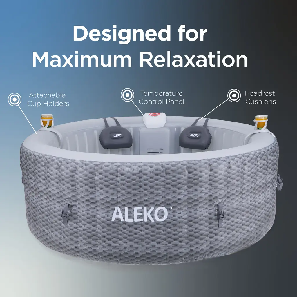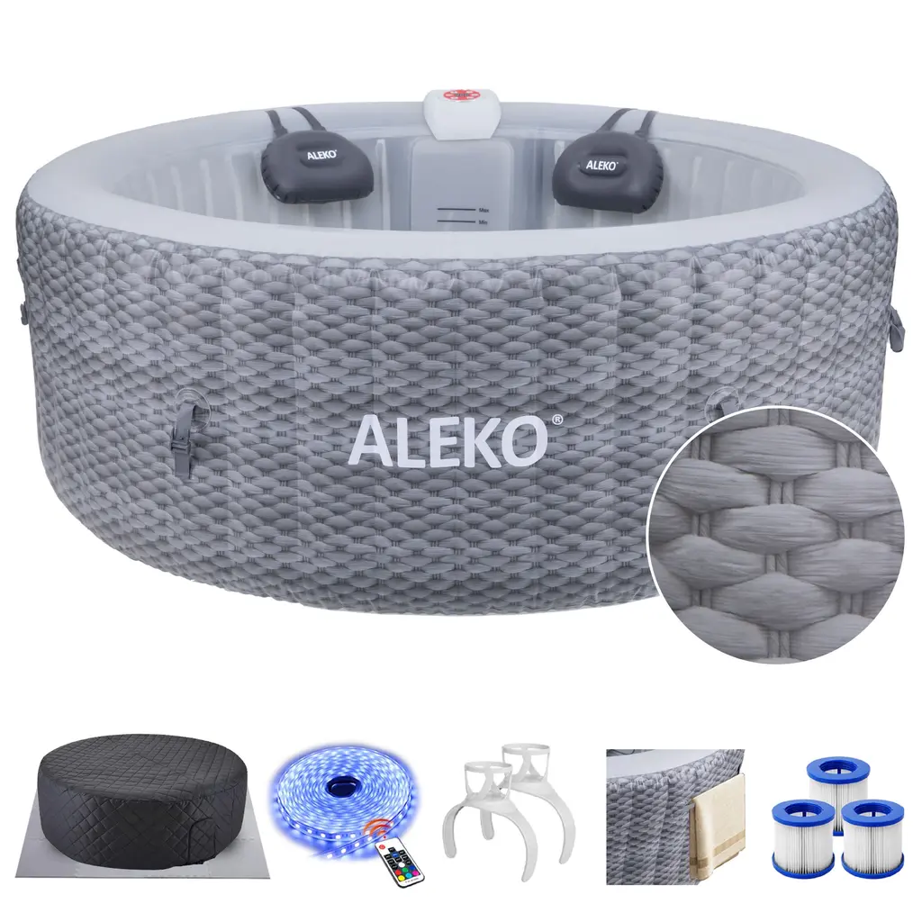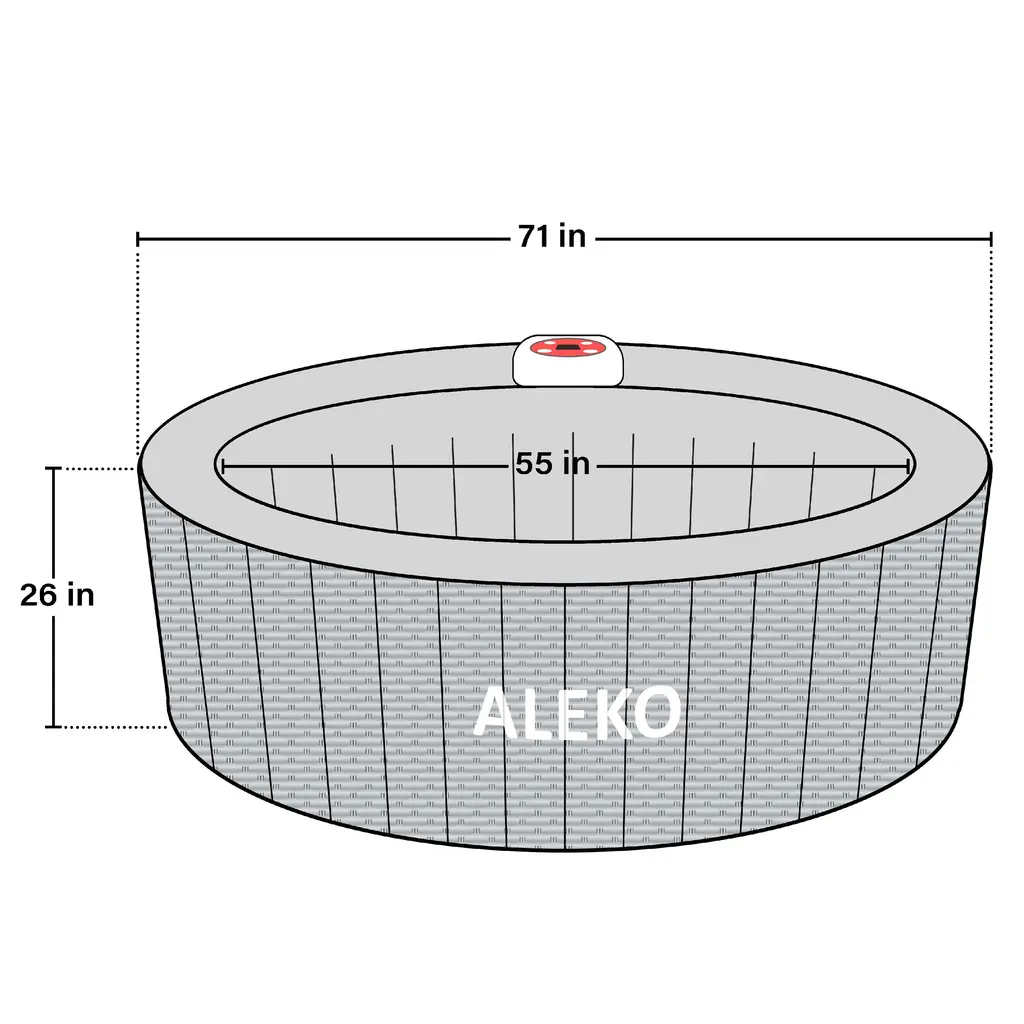 Transform your backyard into a personal oasis with this luxurious 4-person inflatable hot tub. The 120 high-powered jets deliver a soothing 360-degree bubble massage to help you relax and unwind. The included LED strip, with 7 vibrant colors, sets the mood for any occasion, and you can enjoy your favorite drinks without leaving the tub, thanks to the included drink tray and cup holders. Inflatable headrests add extra comfort. Crafted from durable 3-layer puncture-resistant PVC fabric, this hot tub is built to last through all your relaxing soaks. The energy-saving cover works in harmony with the sturdy design, cutting energy usage by 50% while keeping the water warm and ready for your next dip. With easy assembly, you'll be enjoying your personal oasis in no time. Features: ALEKO Inflatable Round 4-person Hot Tub Attachable cup holders included Inflatable headrests / Integrated towel holder 360-degree surrounding bubble massage / 120 high-powered jets Energy-saving cover cuts energy use by 50% Built-in water pump, filtration, and heating system 3-layer puncture-resistant PVC fabric LED strip with 7 colors (operated by included remote control) Digital control panel adjusts water temperature and operates bubble jets Easy assembly Additional Materials: Plastic & Metal Primary Material: PVC Exterior Dimensions: 71L x 71W x 26H in. Interior Dimensions: 55L x 55W x 26H in. Water Gallon Capacity: 211 Gallons Water Temperature Range: 68-104°F Color: Light Gray ( with Hemp Rope Pattern) Warranty: 6-Month Limited Warranty Power Requirements: 120V~60Hz Kit Includes: (1) Inflatable Hot Tub with Towel Holder; (1) Energy Saving Cover; (1) LED Strip with Remote Control; (2) Cup Holders; (2) Inflatable Headrests; (3) Filter Cartridges; (2) Filter Covers; (1) Groundsheet; (1) Inflatable Hose; (1) Clip-On Top Cover; (1) Repair Kit; (1) User Manual