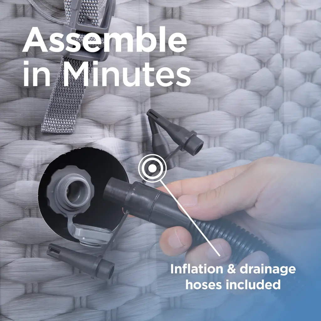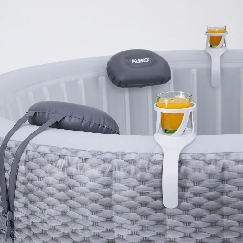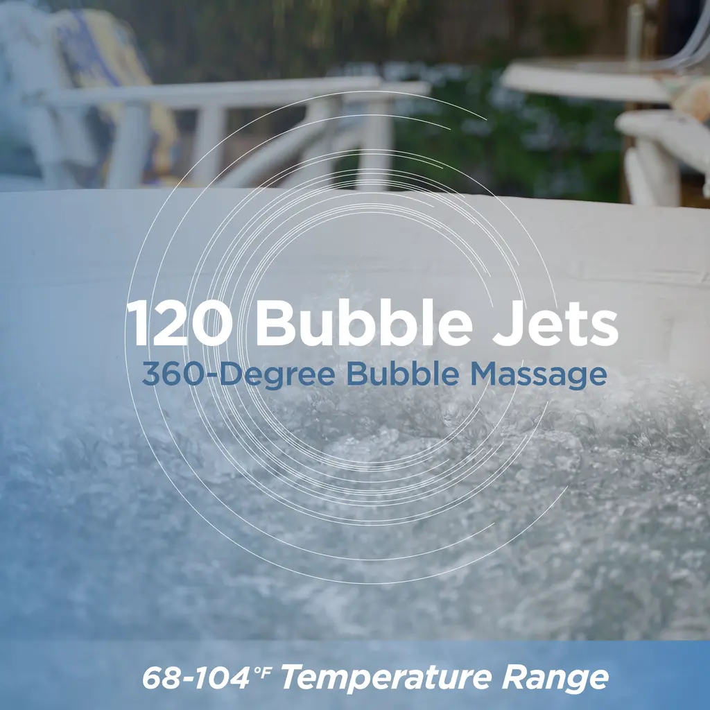 Transform your backyard into a personal oasis with this luxurious 4-person inflatable hot tub. The 120 high-powered jets deliver a soothing 360-degree bubble massage to help you relax and unwind. The included LED strip, with 7 vibrant colors, sets the mood for any occasion, and you can enjoy your favorite drinks without leaving the tub, thanks to the included drink tray and cup holders. Inflatable headrests add extra comfort. Crafted from durable 3-layer puncture-resistant PVC fabric, this hot tub is built to last through all your relaxing soaks. The energy-saving cover works in harmony with the sturdy design, cutting energy usage by 50% while keeping the water warm and ready for your next dip. With easy assembly, you'll be enjoying your personal oasis in no time. Features: ALEKO Inflatable Round 4-person Hot Tub Attachable cup holders included Inflatable headrests / Integrated towel holder 360-degree surrounding bubble massage / 120 high-powered jets Energy-saving cover cuts energy use by 50% Built-in water pump, filtration, and heating system 3-layer puncture-resistant PVC fabric LED strip with 7 colors (operated by included remote control) Digital control panel adjusts water temperature and operates bubble jets Easy assembly Additional Materials: Plastic & Metal Primary Material: PVC Exterior Dimensions: 71L x 71W x 26H in. Interior Dimensions: 55L x 55W x 26H in. Water Gallon Capacity: 211 Gallons Water Temperature Range: 68-104°F Color: Light Gray ( with Hemp Rope Pattern) Warranty: 6-Month Limited Warranty Power Requirements: 120V~60Hz Kit Includes: (1) Inflatable Hot Tub with Towel Holder; (1) Energy Saving Cover; (1) LED Strip with Remote Control; (2) Cup Holders; (2) Inflatable Headrests; (3) Filter Cartridges; (2) Filter Covers; (1) Groundsheet; (1) Inflatable Hose; (1) Clip-On Top Cover; (1) Repair Kit; (1) User Manual