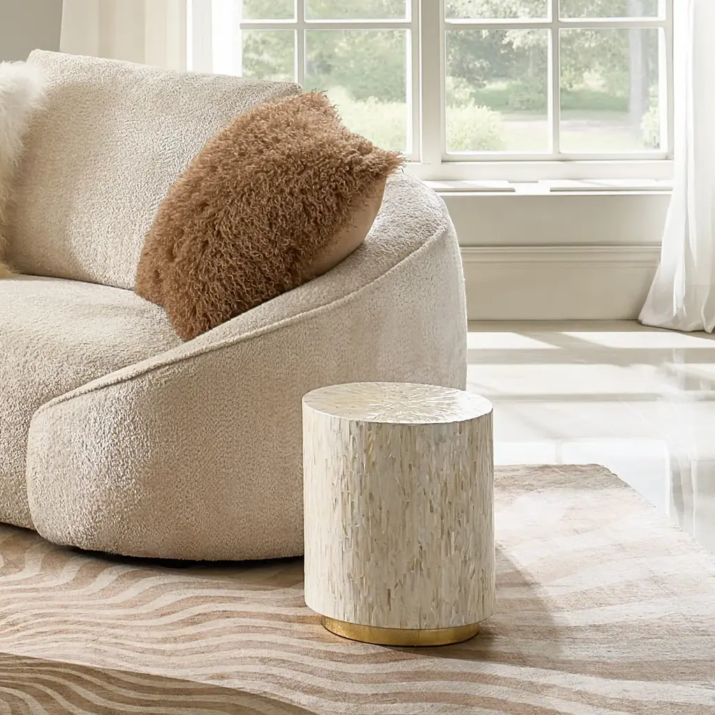 Our Alexandria Mosaic Table is the prettiest central perch for entertaining. Mother-of-pearl mingles with a cool ivory finish, creating a light-catching mosaic. A go-to golden leaf base elevates our glam design.